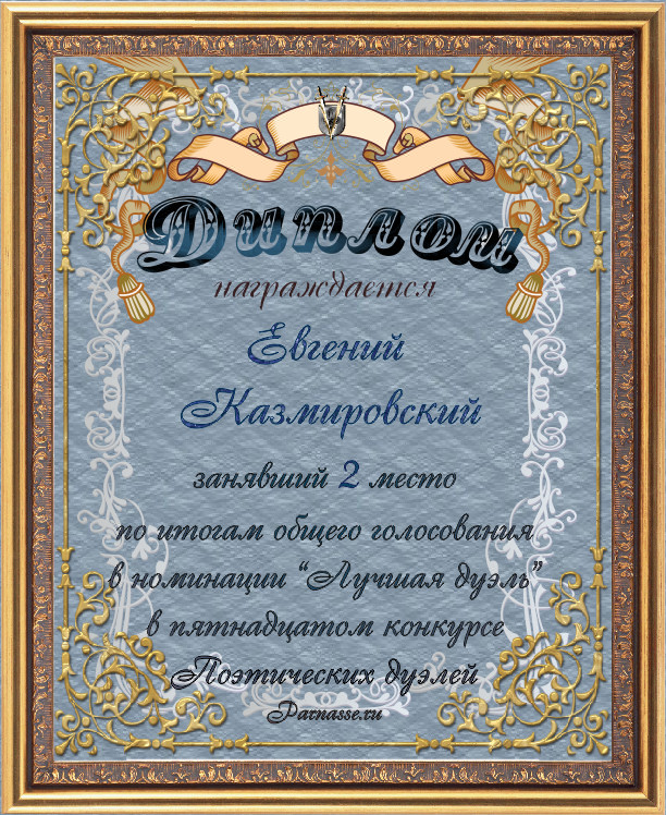 Диплом за 2-е место в номинации "ЛУЧШАЯ ДУЭЛЬ" по итогам общего голосования в 15ом конкурсе поэтических дуэлей (№ 23.1)