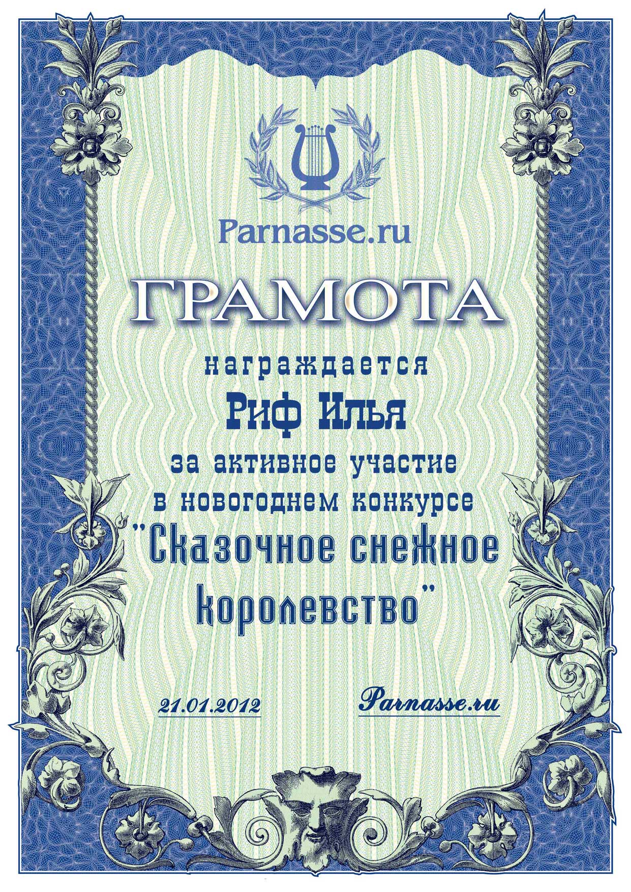 От лица Администрации творческого портала "Парнас" вручаем Вам этот памятный знак с самыми наилучшими пожеланиями! Пусть Вас весь год не покидает творческий запал, удача, а здоровье будет столь же крепким и нерушимым, как и традиция Новогоднего праздника! Счастья, успехов и любви Вам и Вашей семье, друзьям и близким!