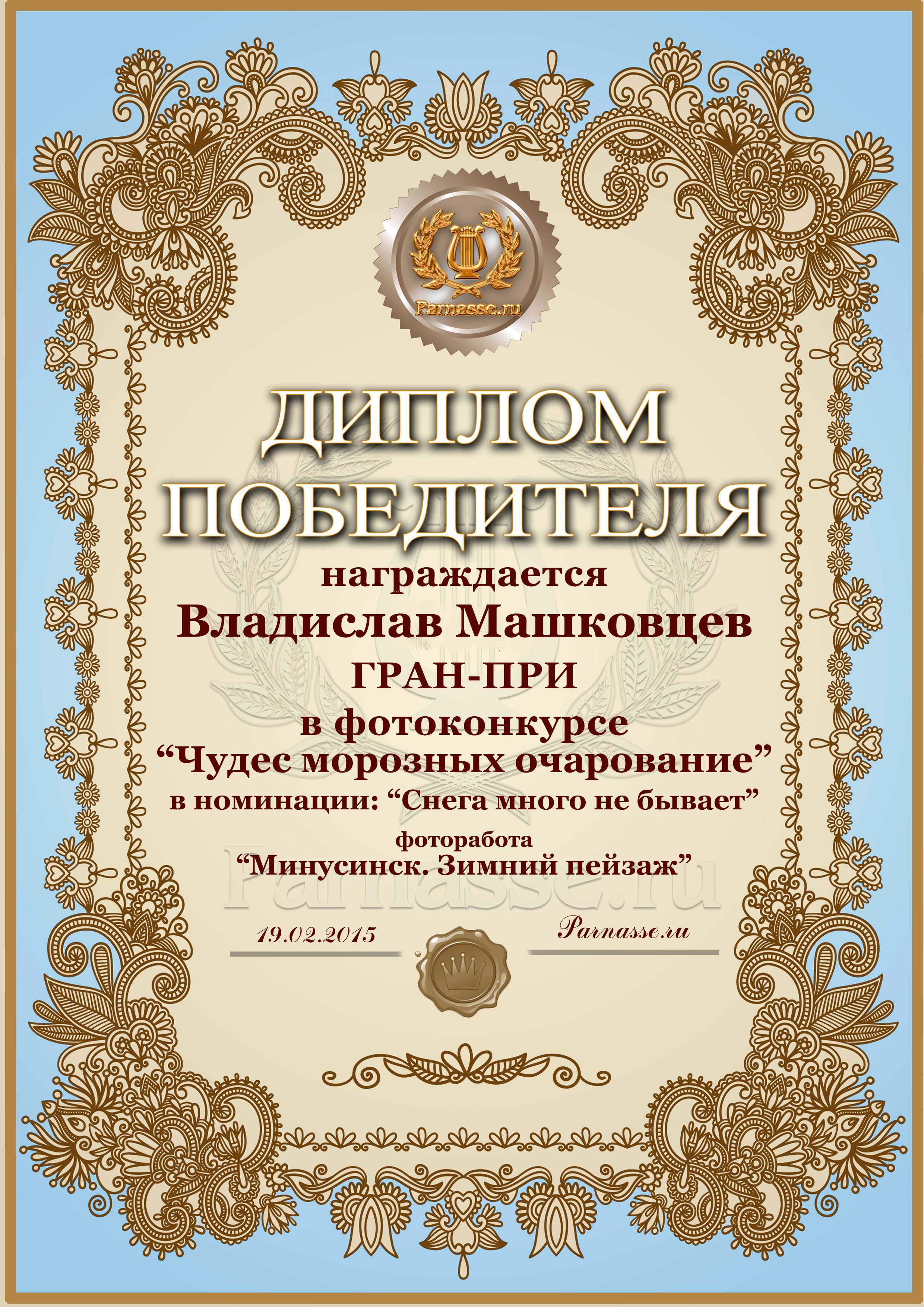 Диплом за ГРАН-ПРИ в фотоконкурсе "Чудес морозных очарование"