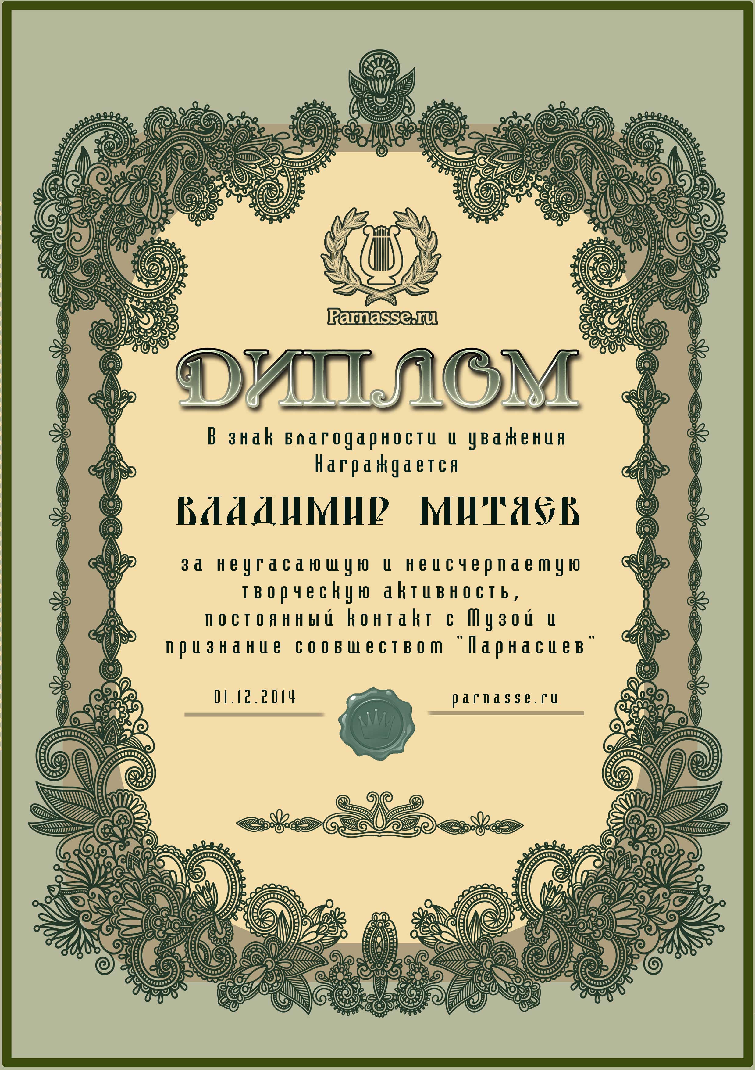За неугасающую и неисчерпаемую творческую активность, постоянный контакт с Музой и признание сообществом "Парнасцев".От всей души желаем Вам, Владимир, здоровья, любви, успехов, благополучия, удачи и творческого вдохновения!