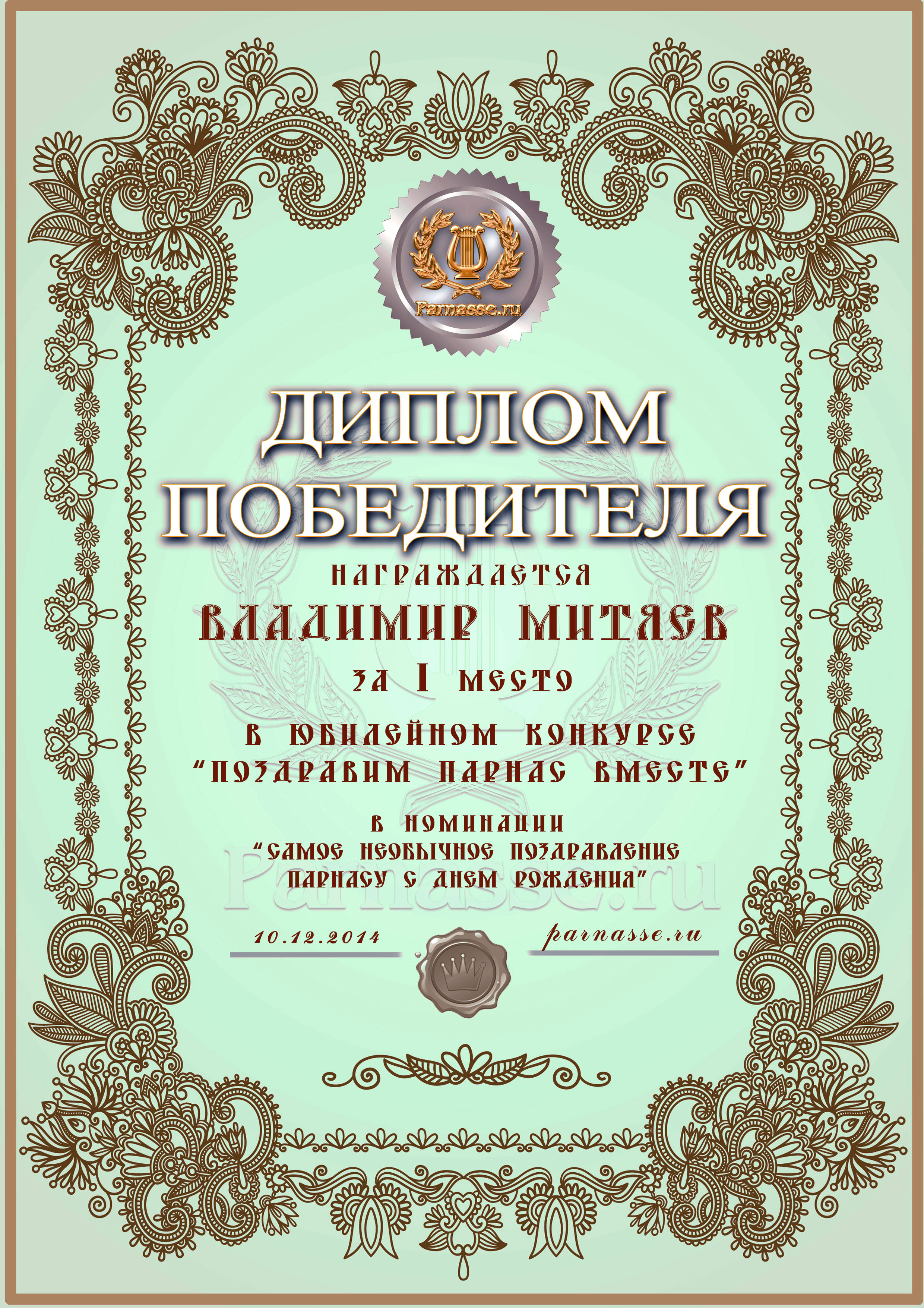 Диплом Победителя за 1 место в праздничном конкурсе "Поздравим Парнас с трёхлетием вместе!"