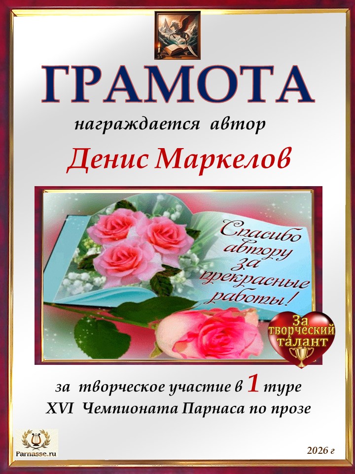 ![]() Медаль автора-участника в 1 туре XVI Чемпионата Парнаса по прозе