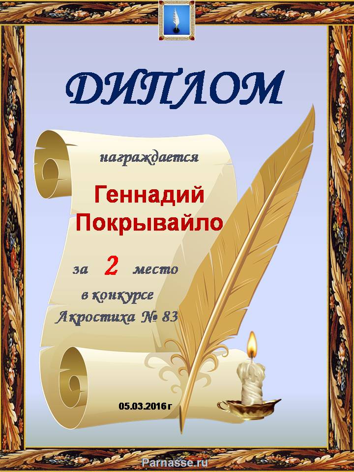Диплом за 2 место в 47 конкурсе АКРОСТИХА (Альтернатива)!