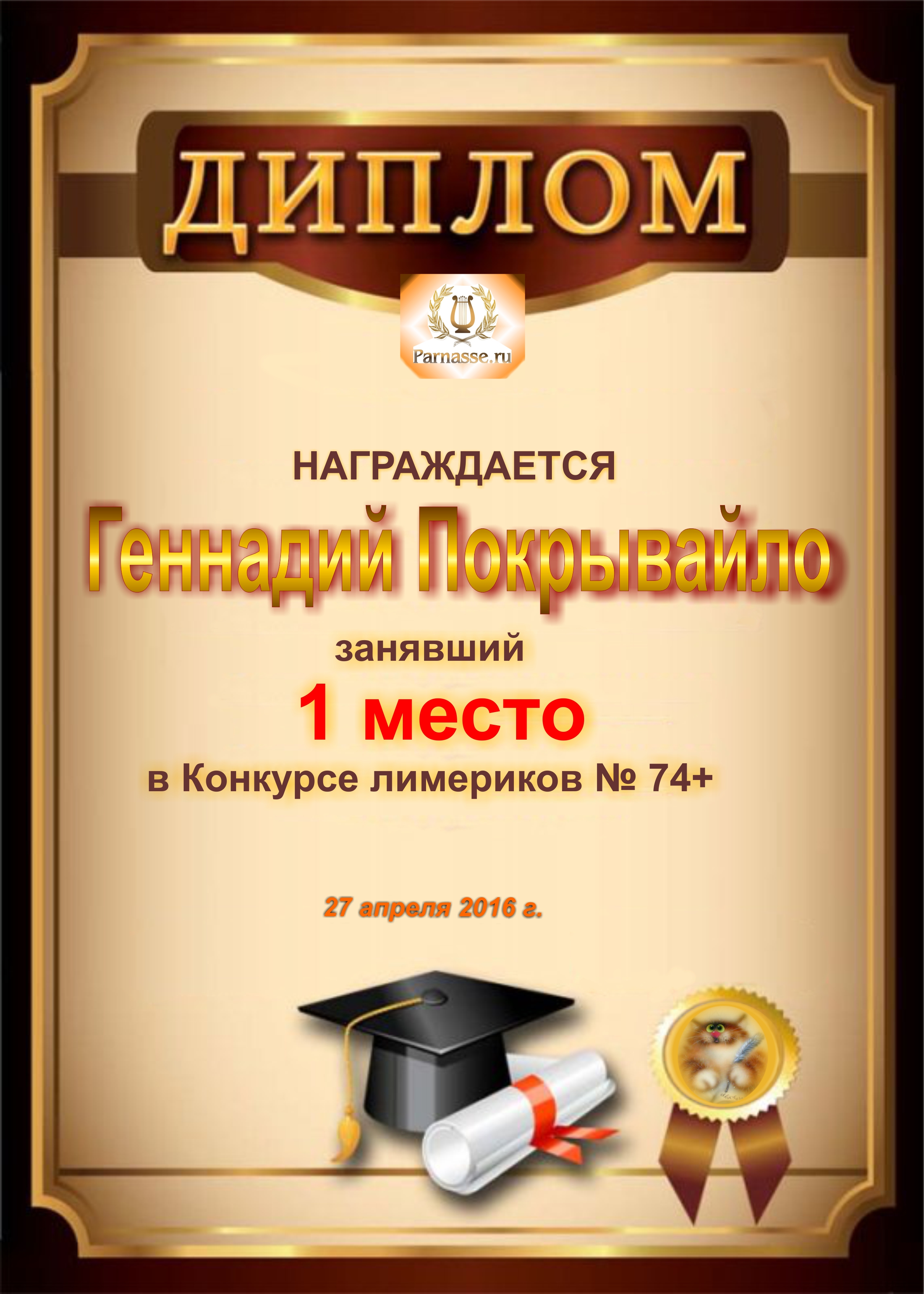 Диплом за победу и 3 место в конкурсе лимериков № 53+ (4.05.2014 г.)