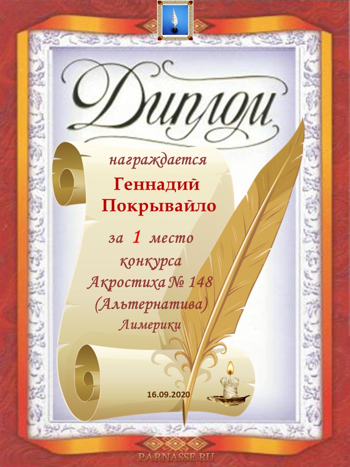 Диплом за победу и 1 место в дополнительной номинации конкурса лимериков № 38+ (8.07.2013 г.)