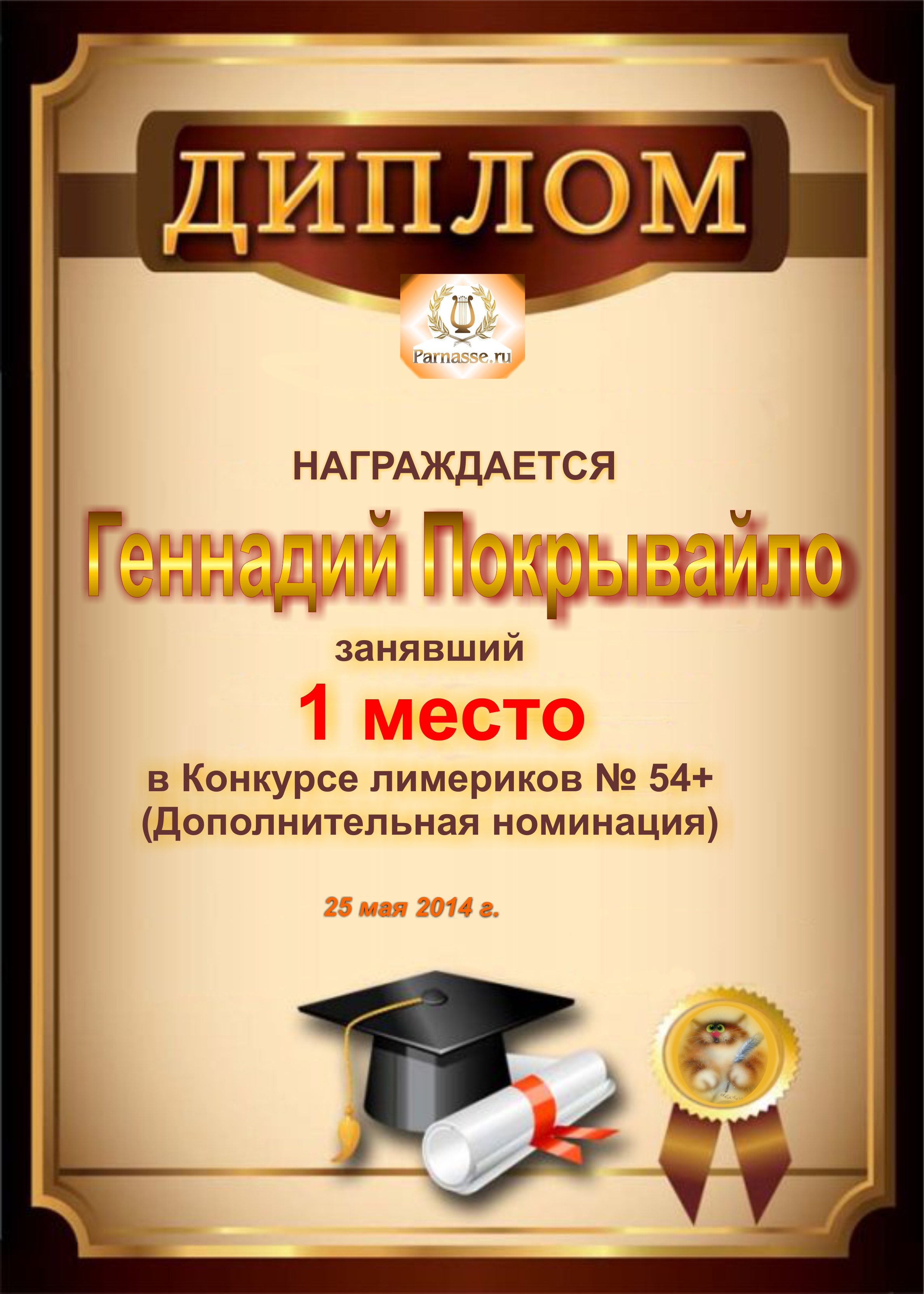 Диплом за победу и 1 место в дополнительной номинации конкурса лимериков № 54+ (25.05.2014г.)