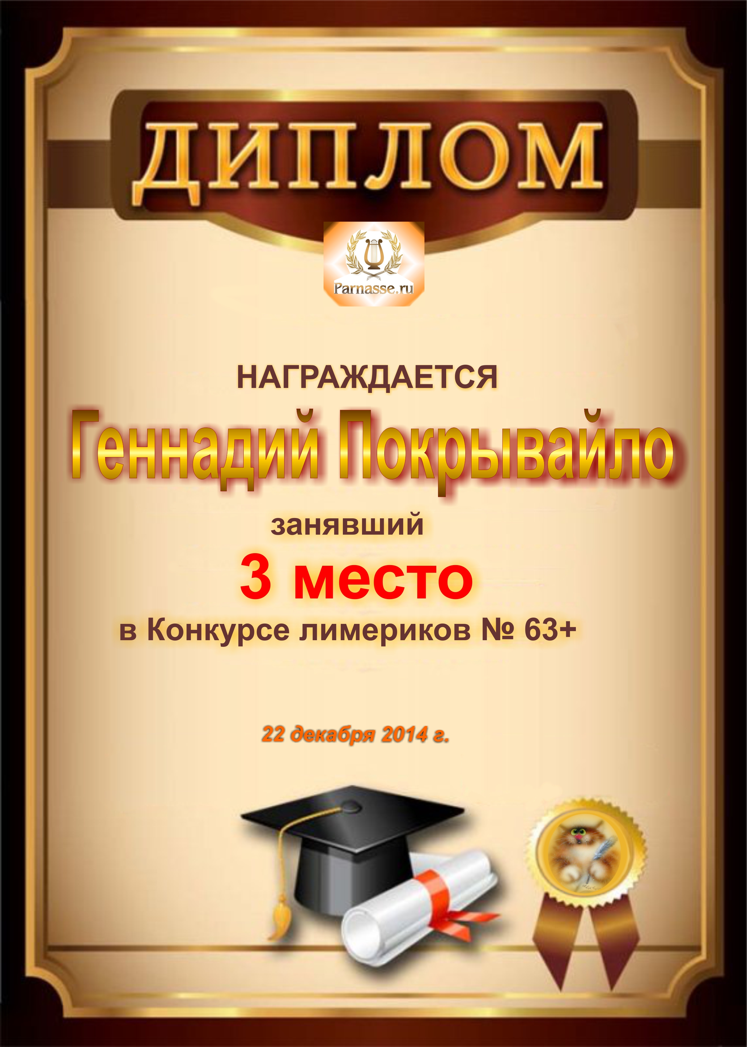 Диплом за победу и 3 место в конкурсе лимериков № 63+ (22.12.2014г.)