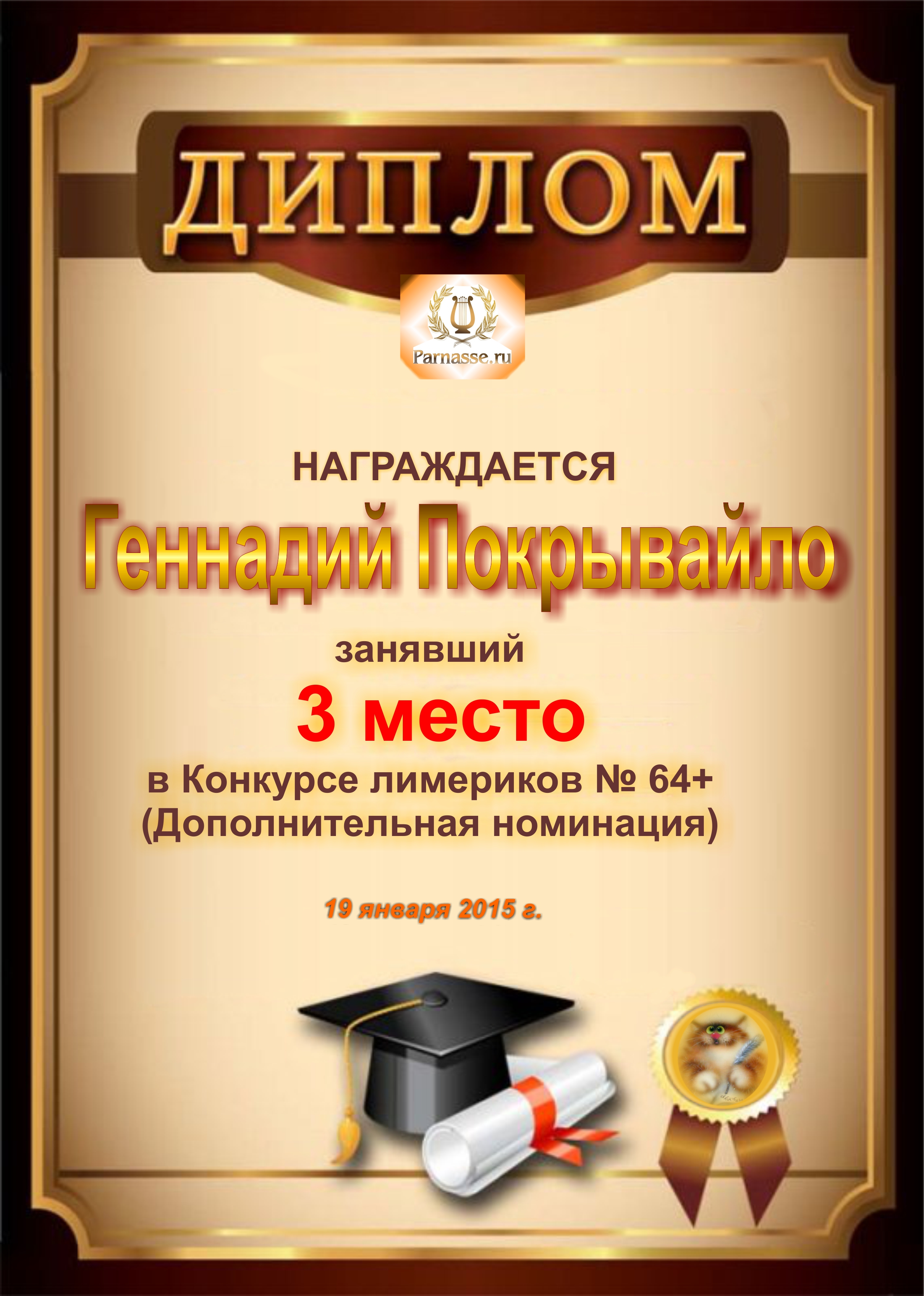 Диплом за победу и 3 место в дополнительной номинации конкурса лимериков № 64+ (19.01.2015г.)