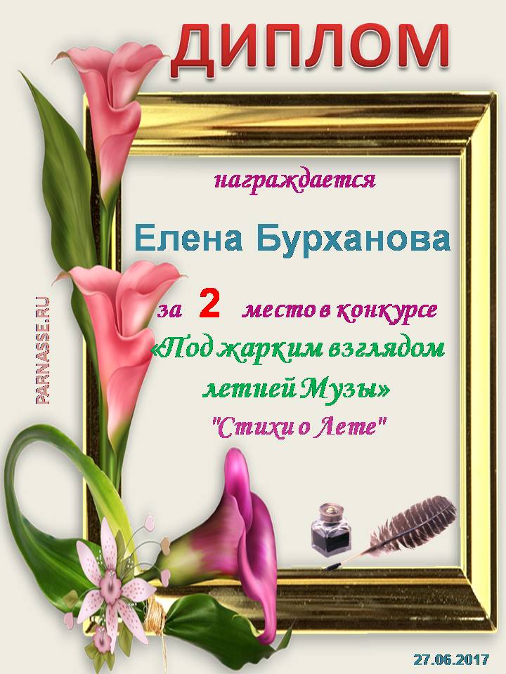 Победителю конкурса:"Под жарким взглядом летней музы". Поздравляем со 2 местом в номинации - "Стихи о лете"