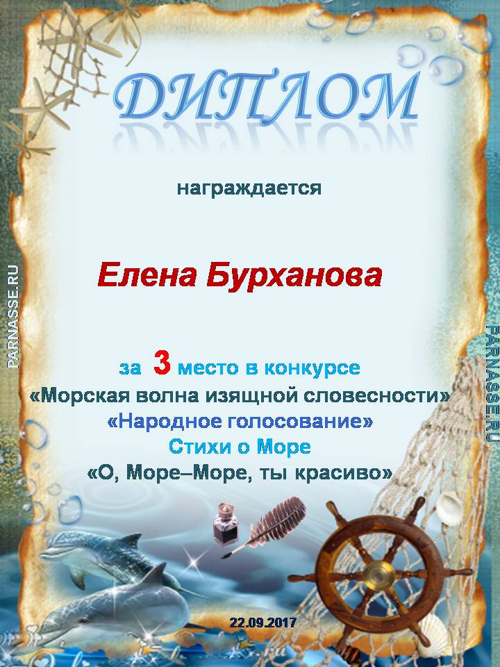 Елена, поздравляем с прекрасной победой - с 3 местом в номинации - Рассказы и сказки о море "Морские путешествия" - народное голосование!