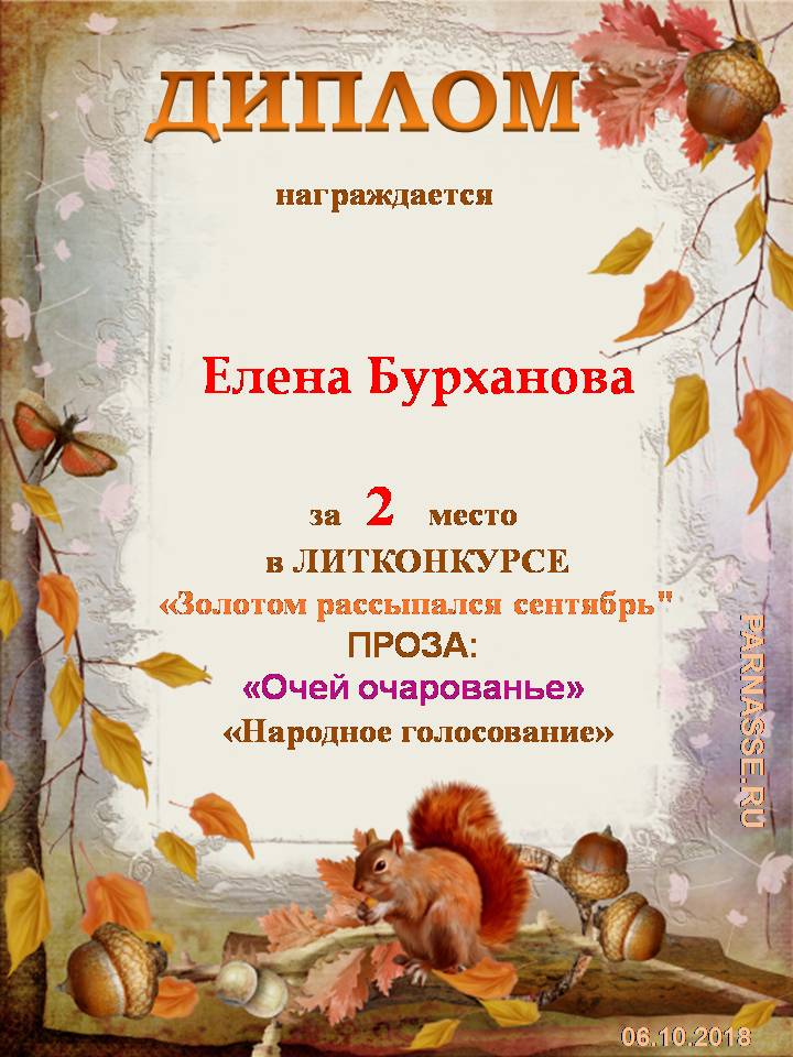 Поздравляем с занятым 2 местом в ЛИТКОНКУРСе «Золотом рассыпался сентябрь.,,», номинация – Проза (народное голосование)!