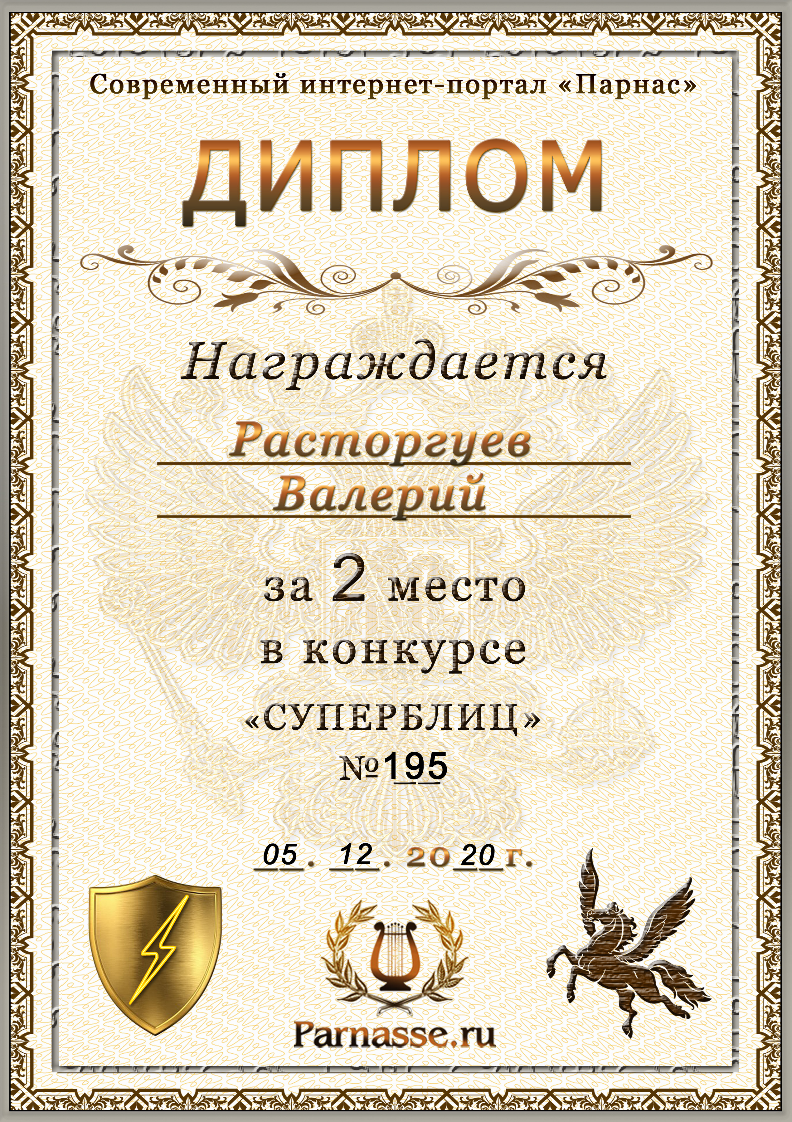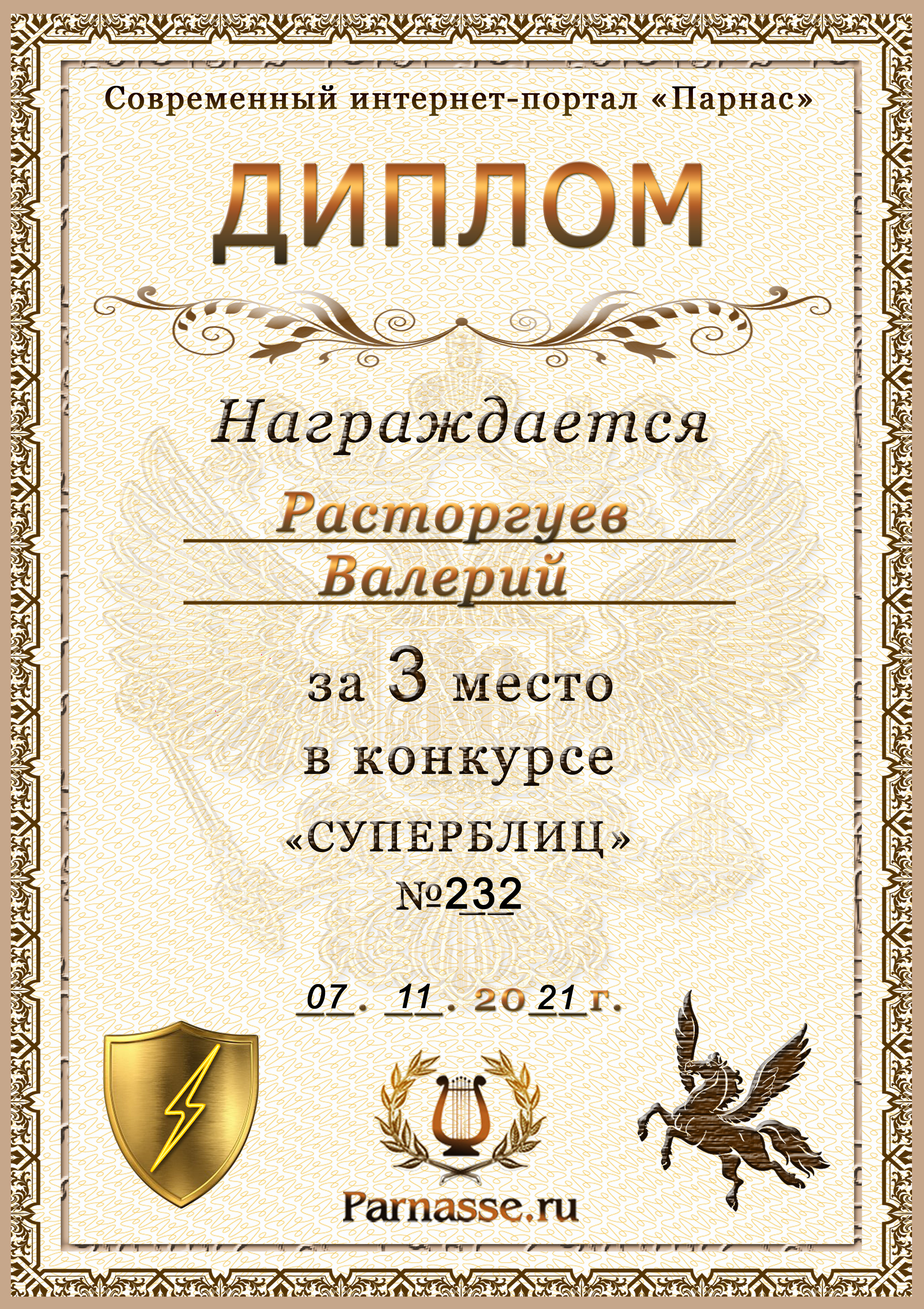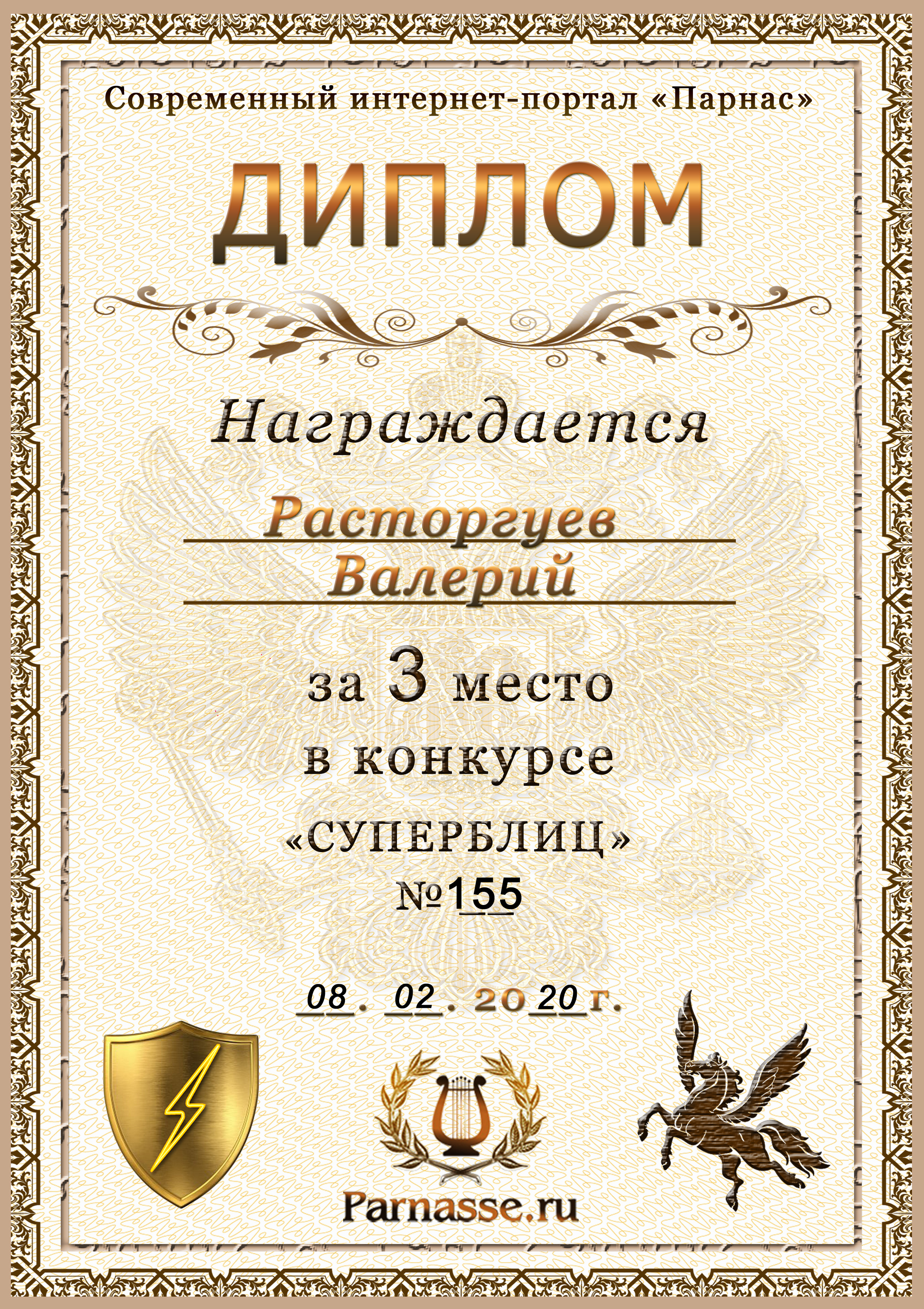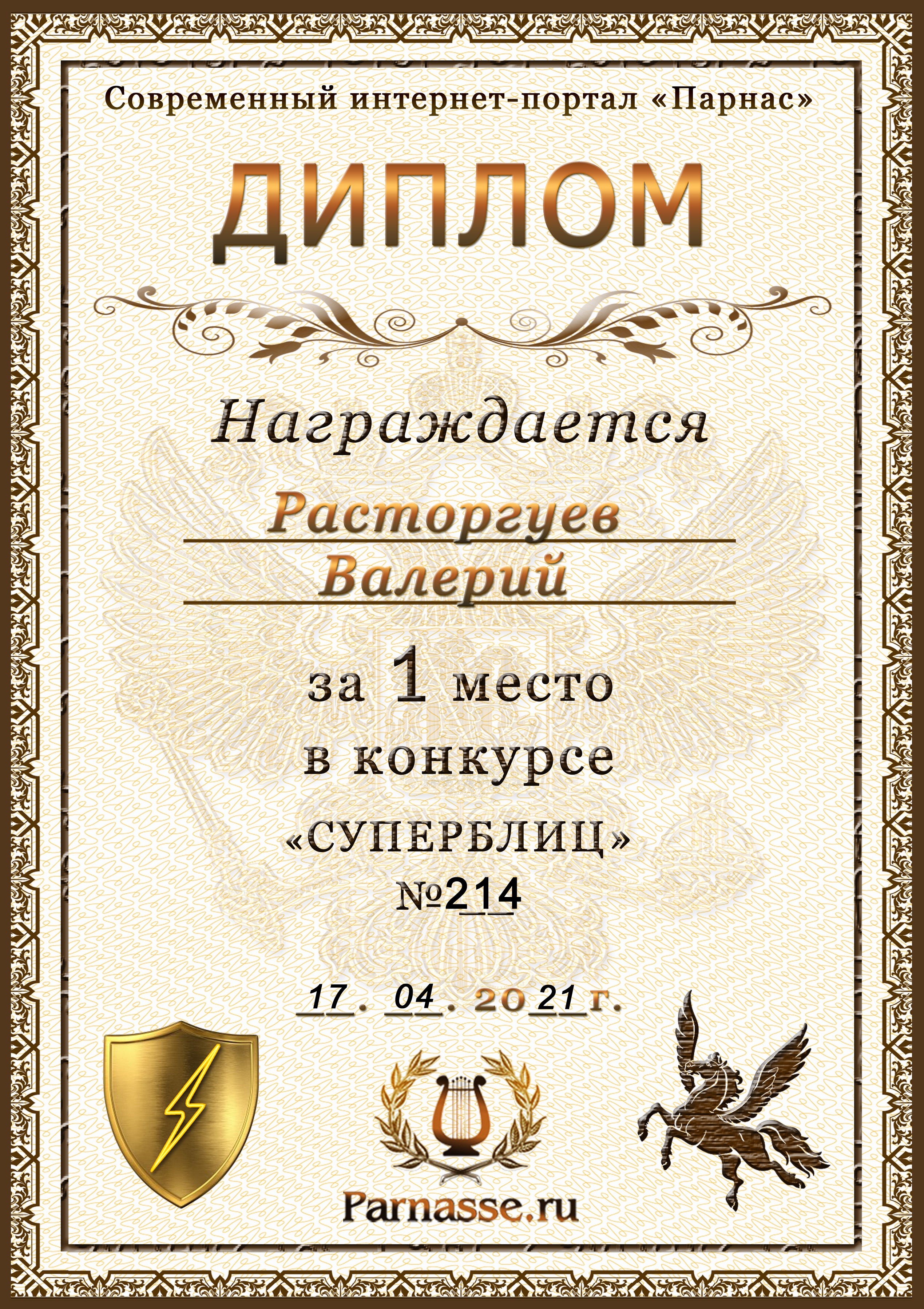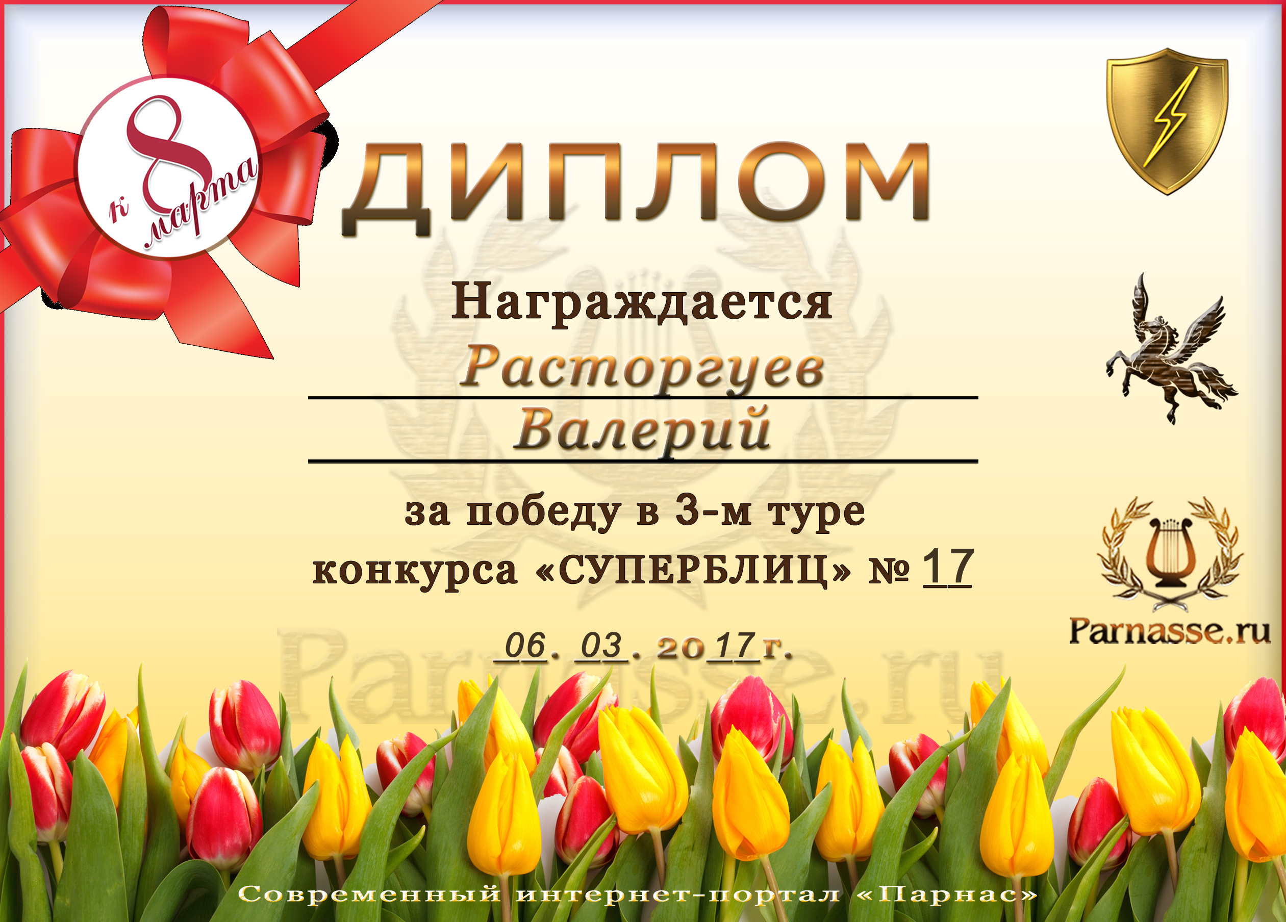 Диплом за 1 место в праздничном конкурсе "Поздравим Парнас с трёхлетием вместе!"