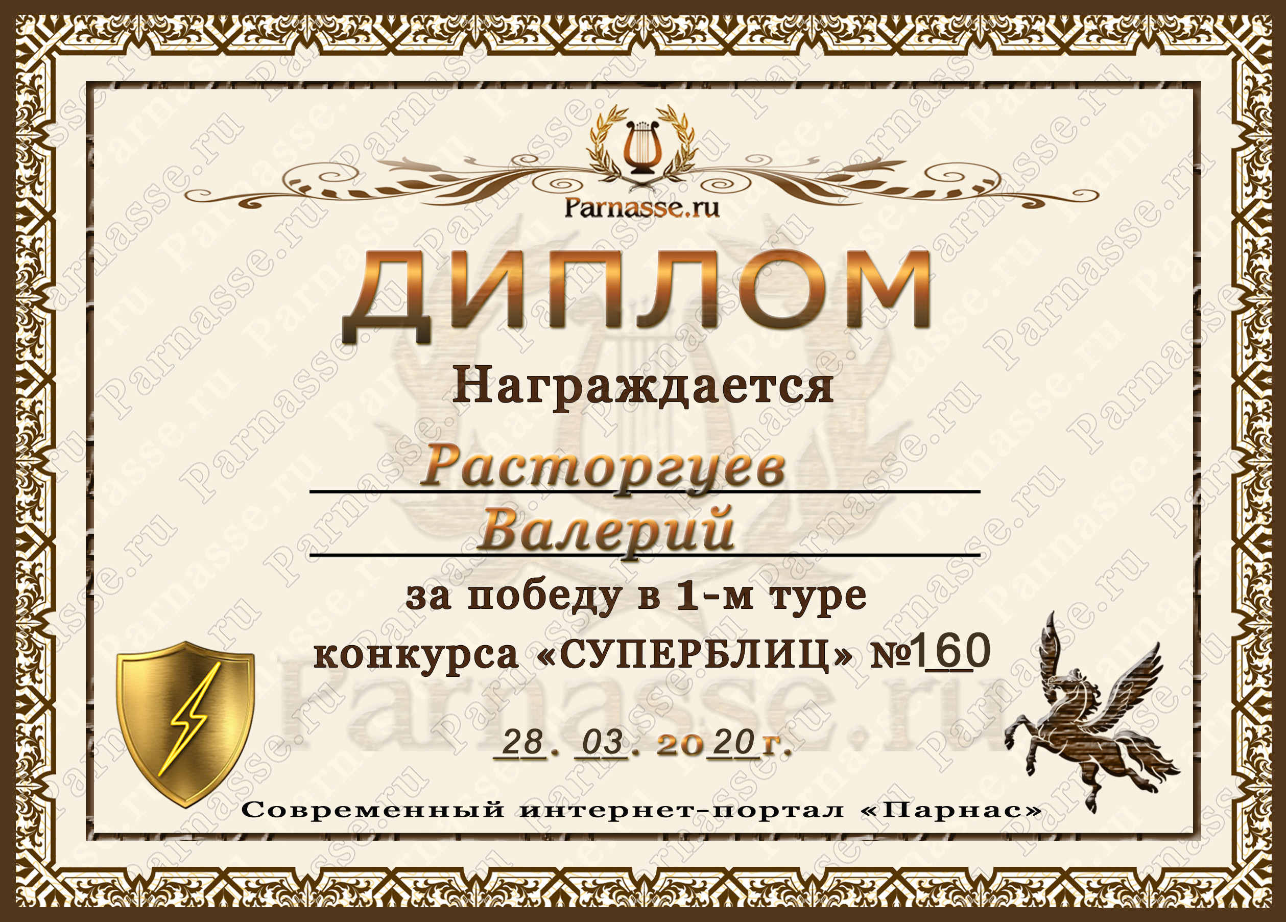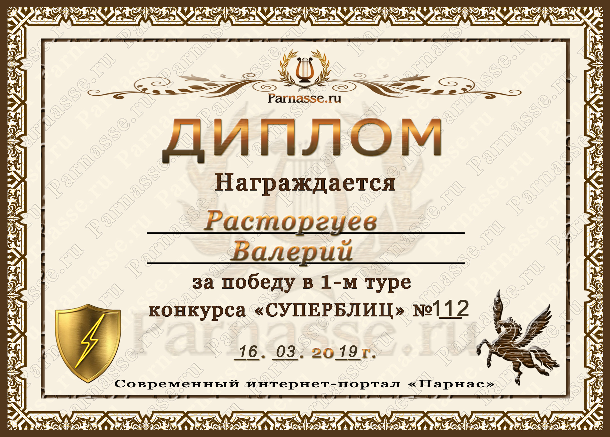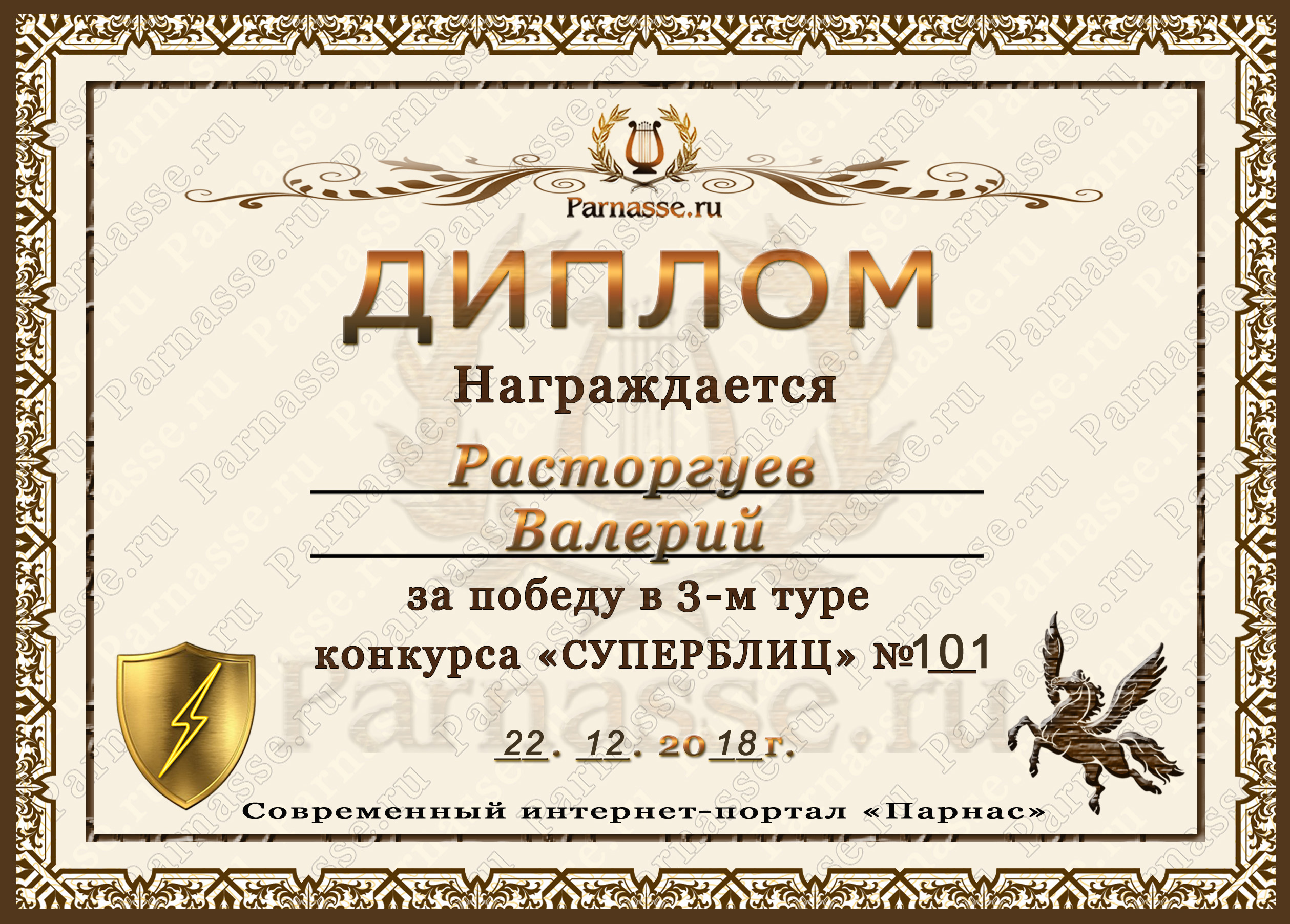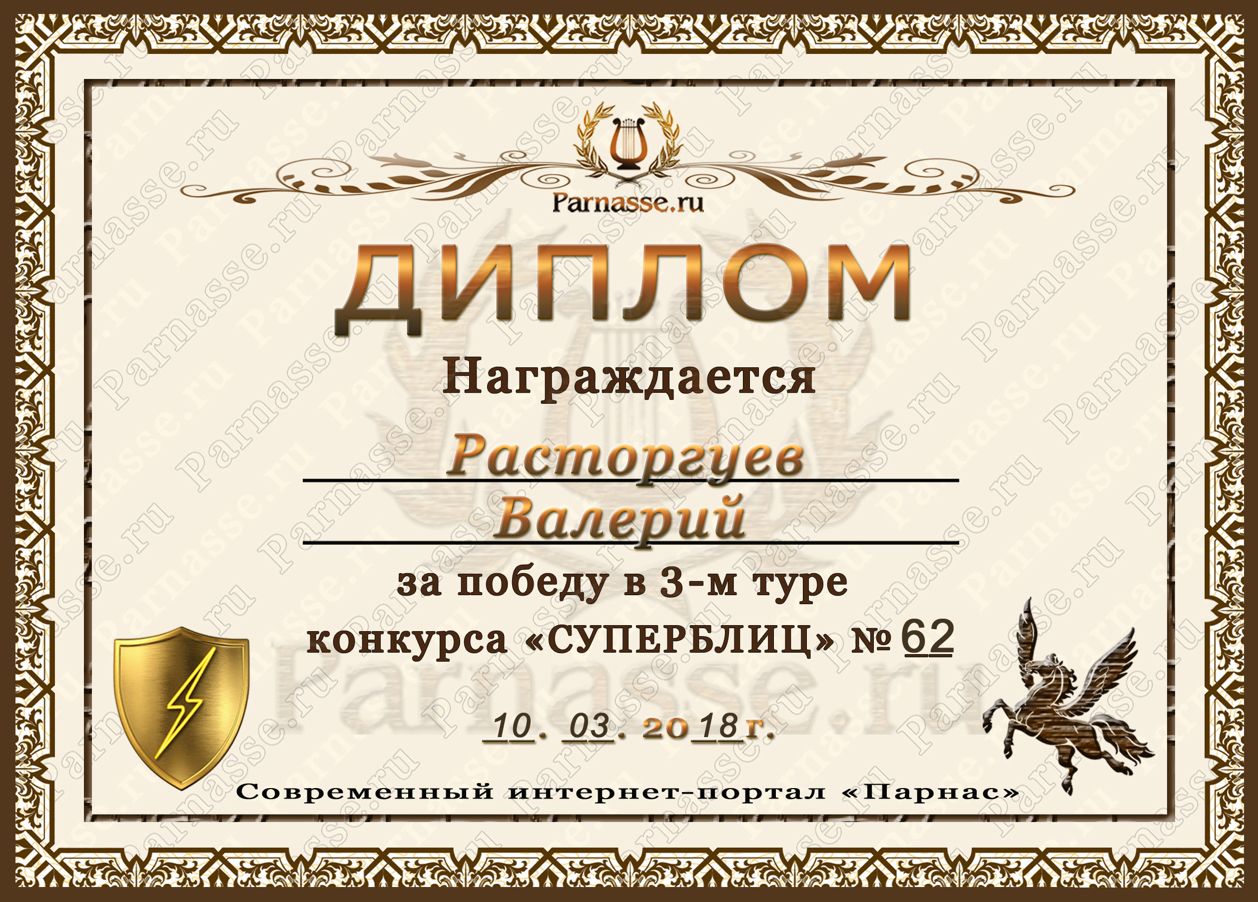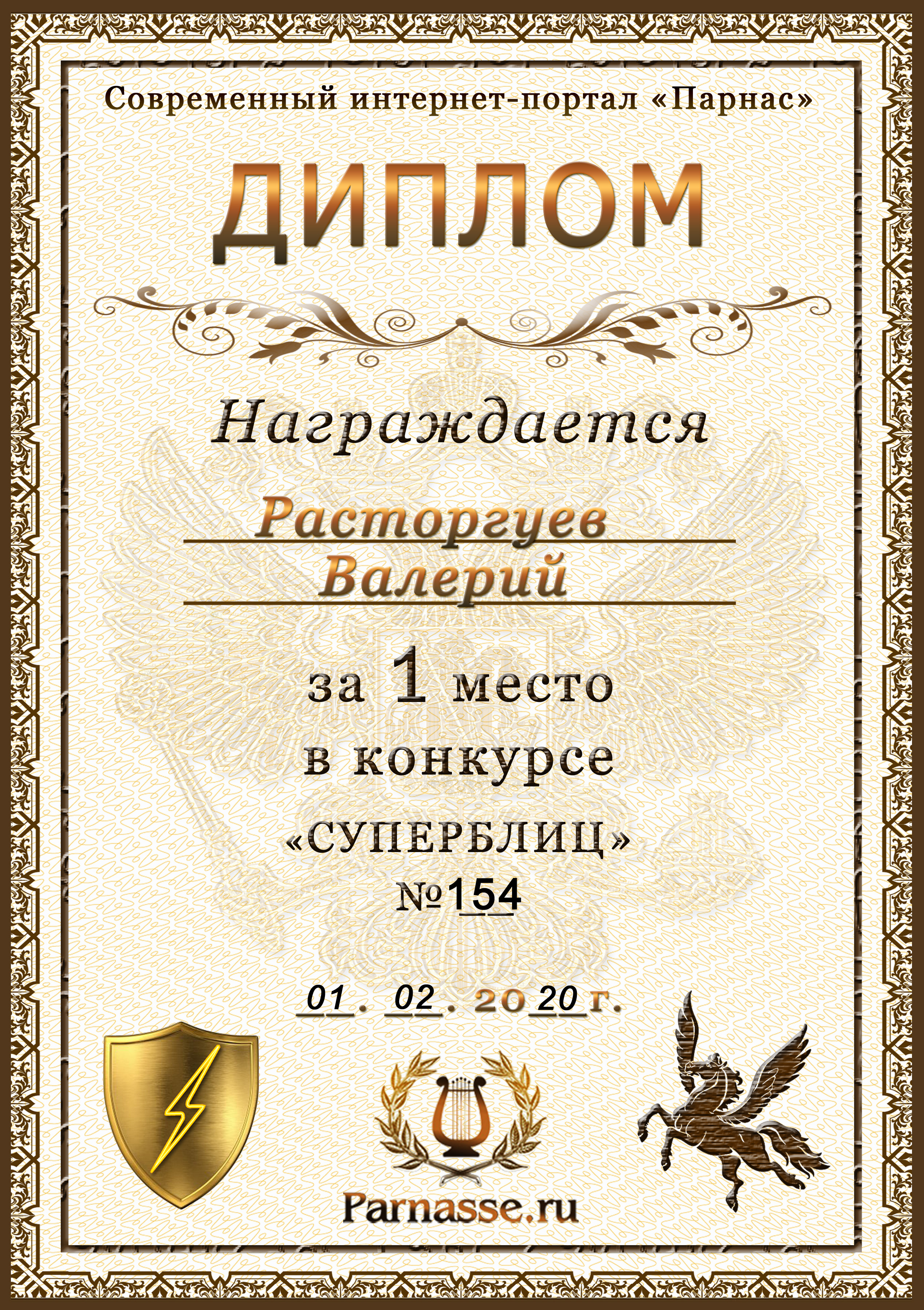 Диплом за 1 место в праздничном конкурсе "Поздравим Парнас с трёхлетием вместе!"