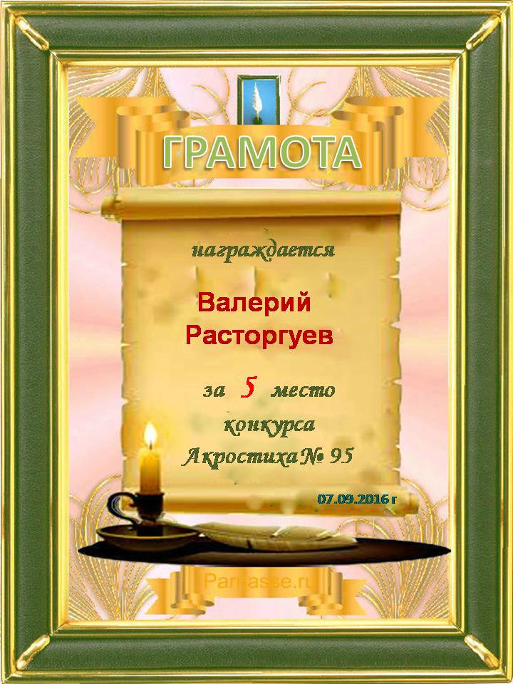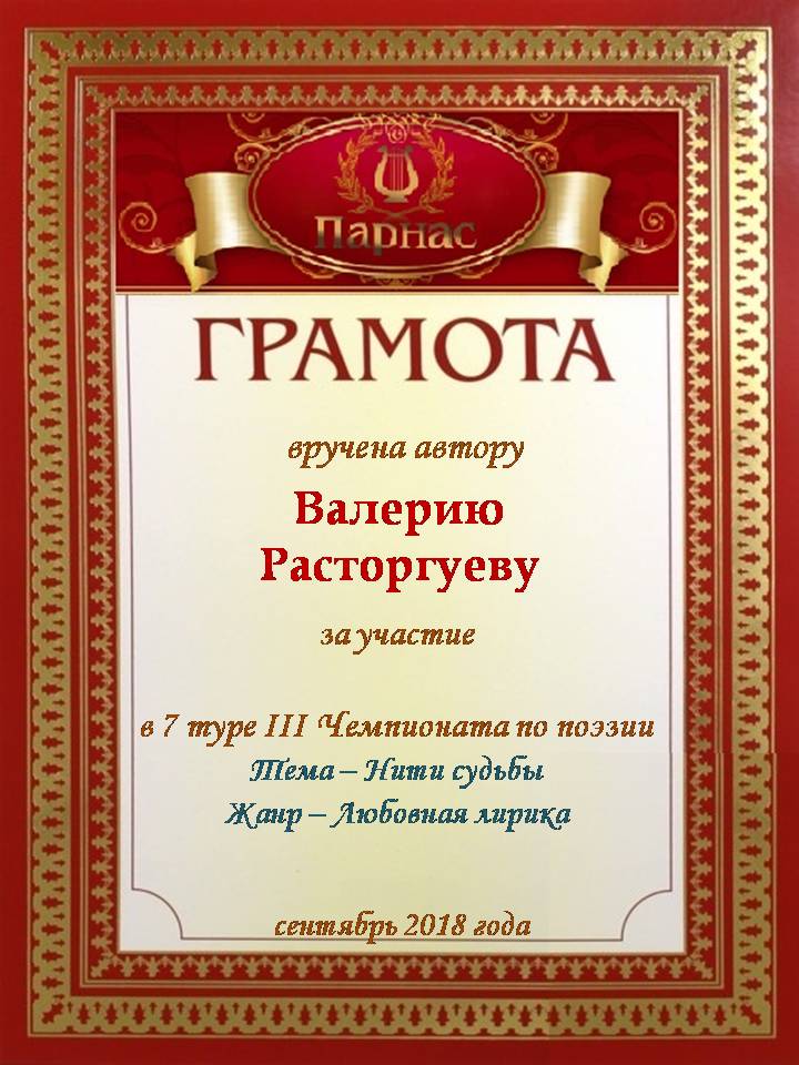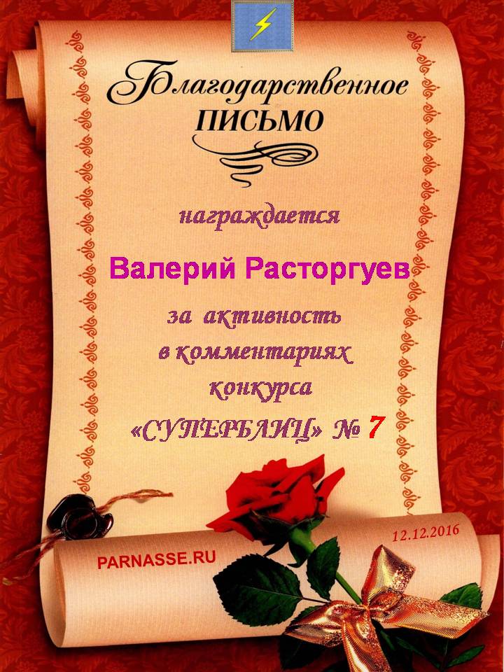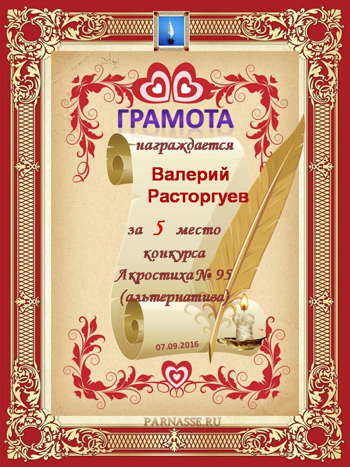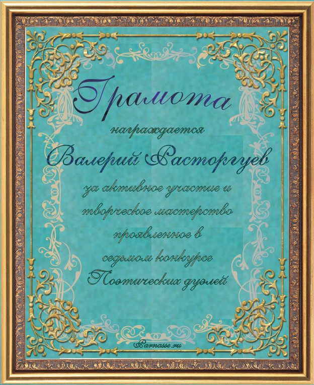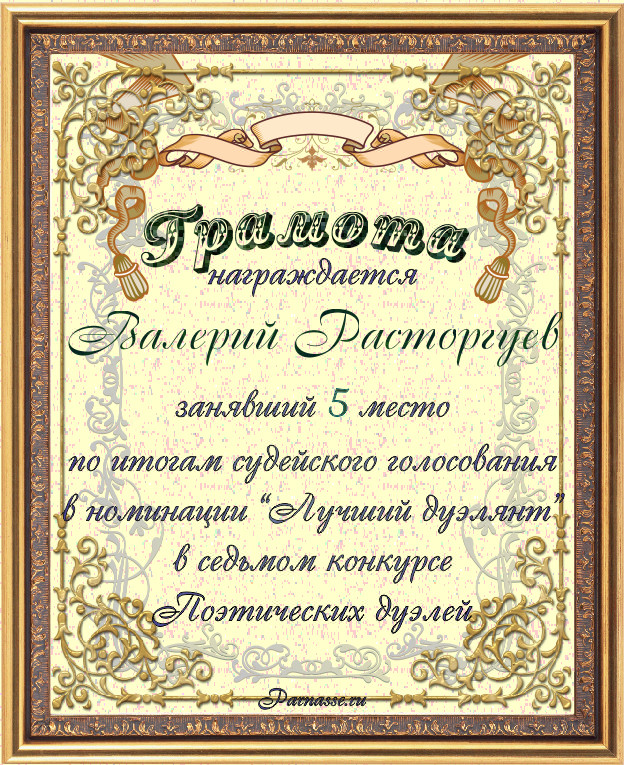 Грамота за 5-е место в номинации "Лучший дуэлянт" по итогам общего голосования в седьмом конкурсе поэтических дуэлей