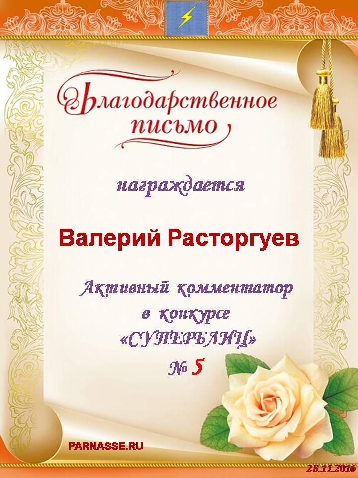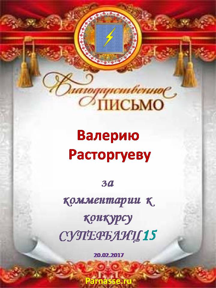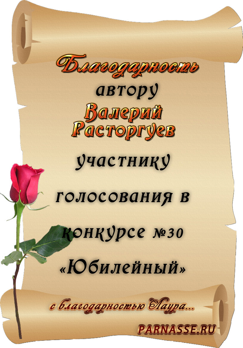 Позвольте Вас от всей души поблагодарить за участие в юбилейном конкурсе, за великолепные поздравления и пожелания нашему "Парнасу", разменявшему уже третий год – серьезный возраст по мерам Интернета! Очень признательны за Ваши прекрасные слова, желаем Вам всех-всех благ в будущем и новых высот в творчестве! Спасибо!