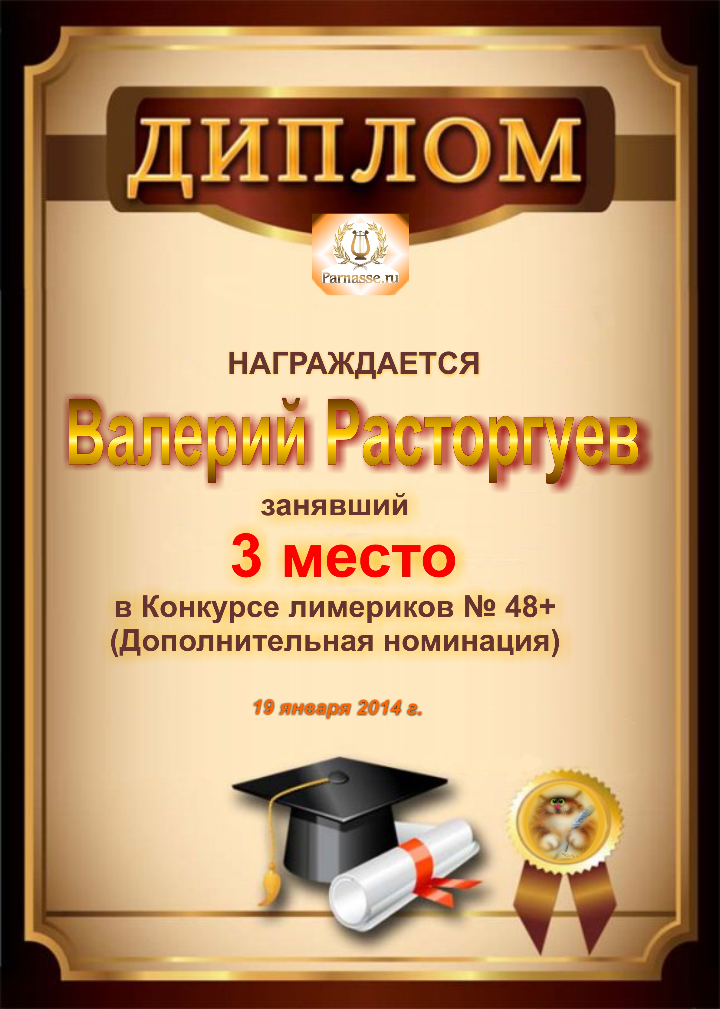 Диплом за победу и 3 место в дополнительной номинации конкурса лимериков № 48+ (19.01.2014г.)