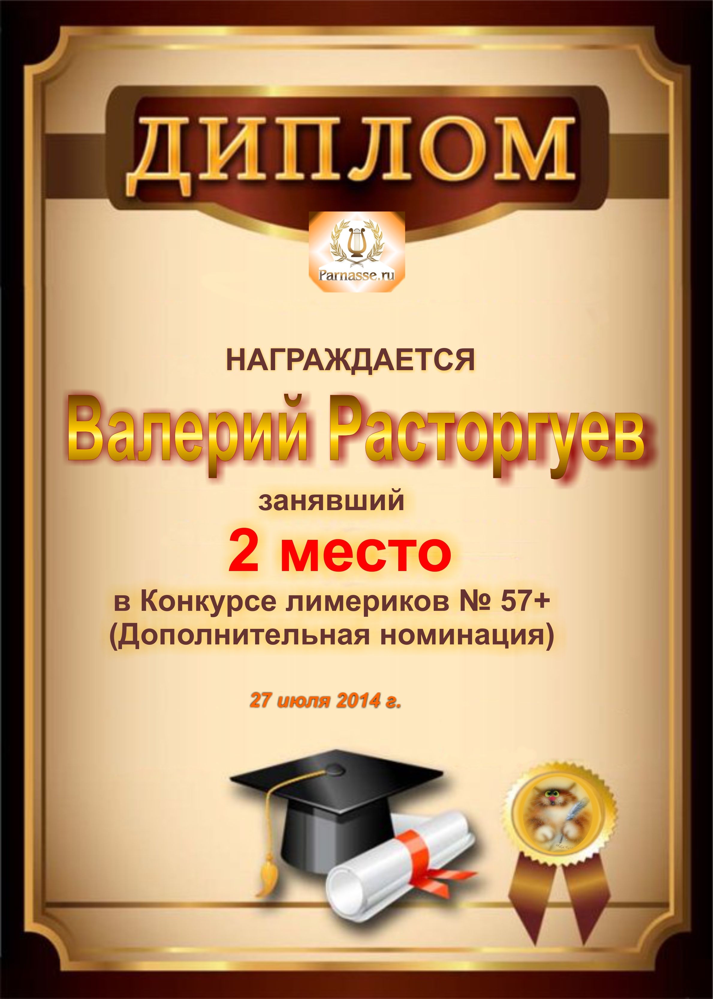 Диплом за победу и 2 место в дополнительной номинации конкурса лимериков № 50+ (2.03.2014 г.)