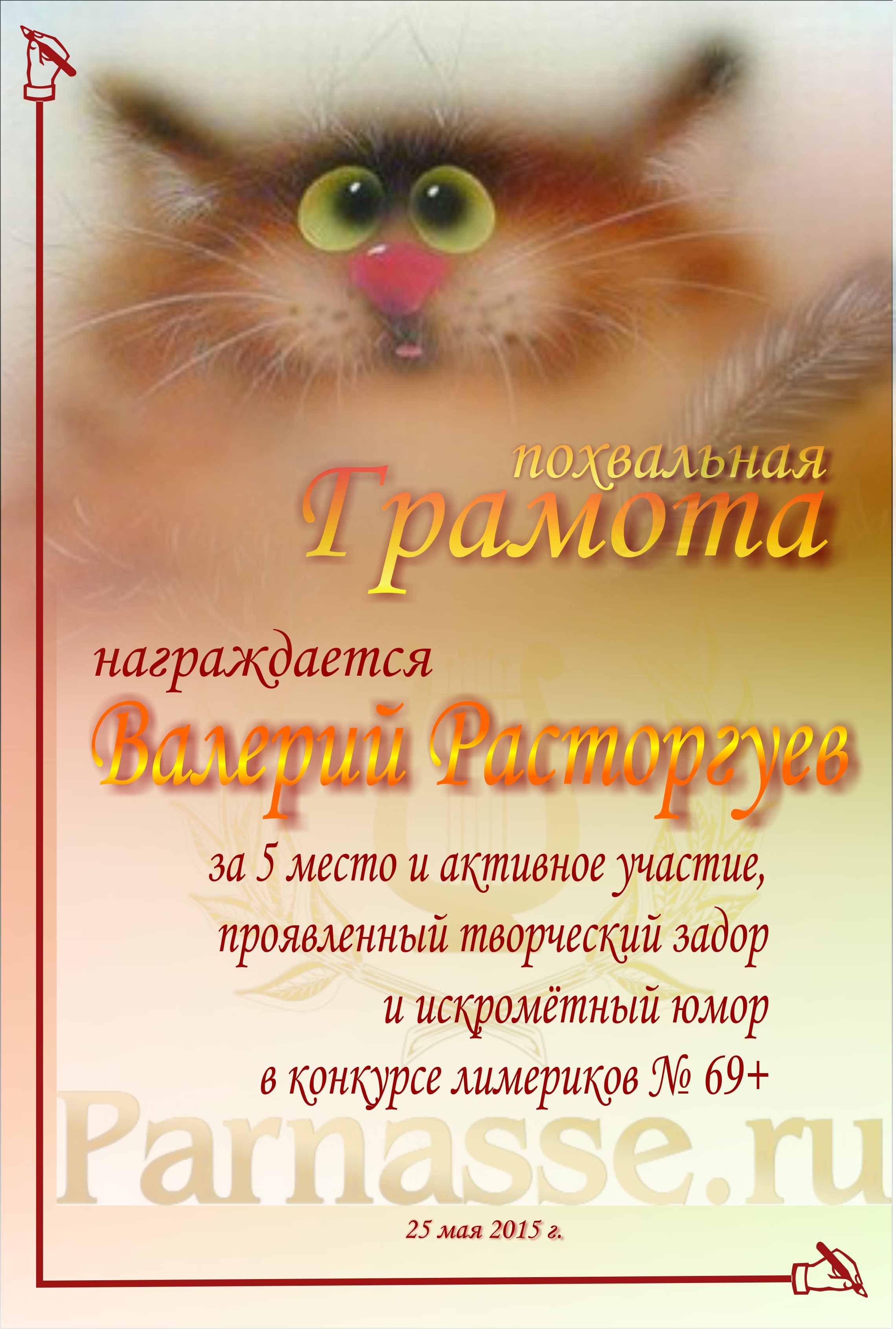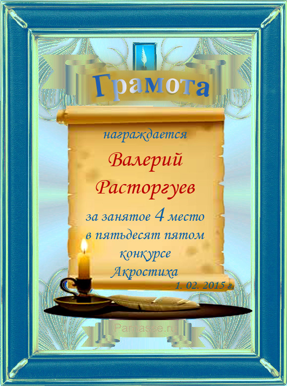 Похвальная грамота за 4 место и активное участие в конкурсе лимериков № 65+ (9.02.2015 г.)
