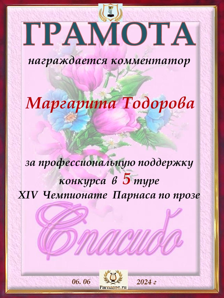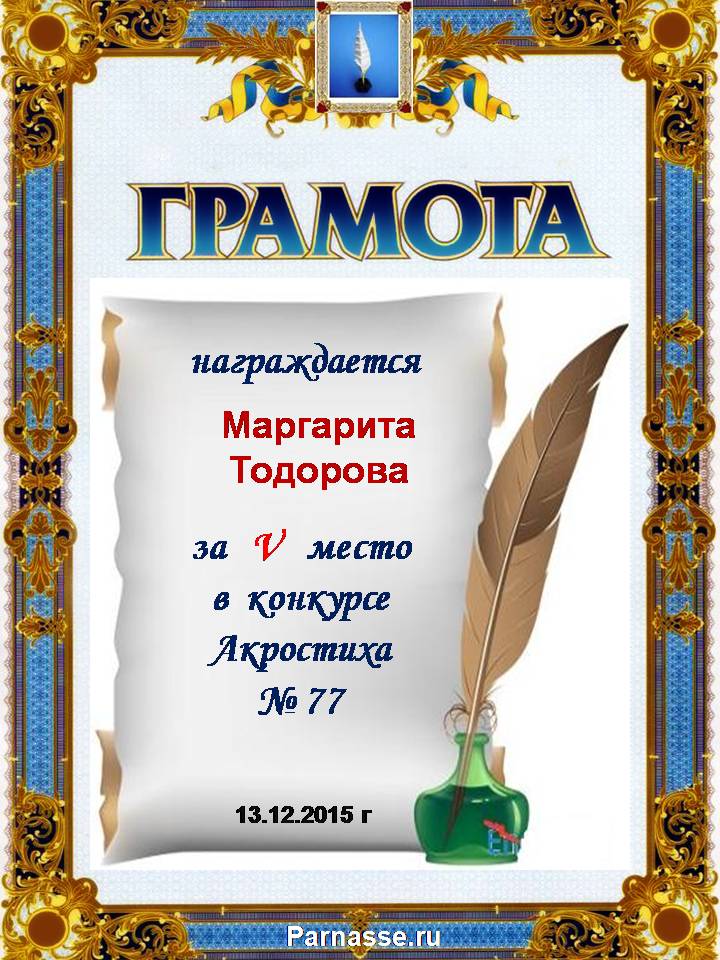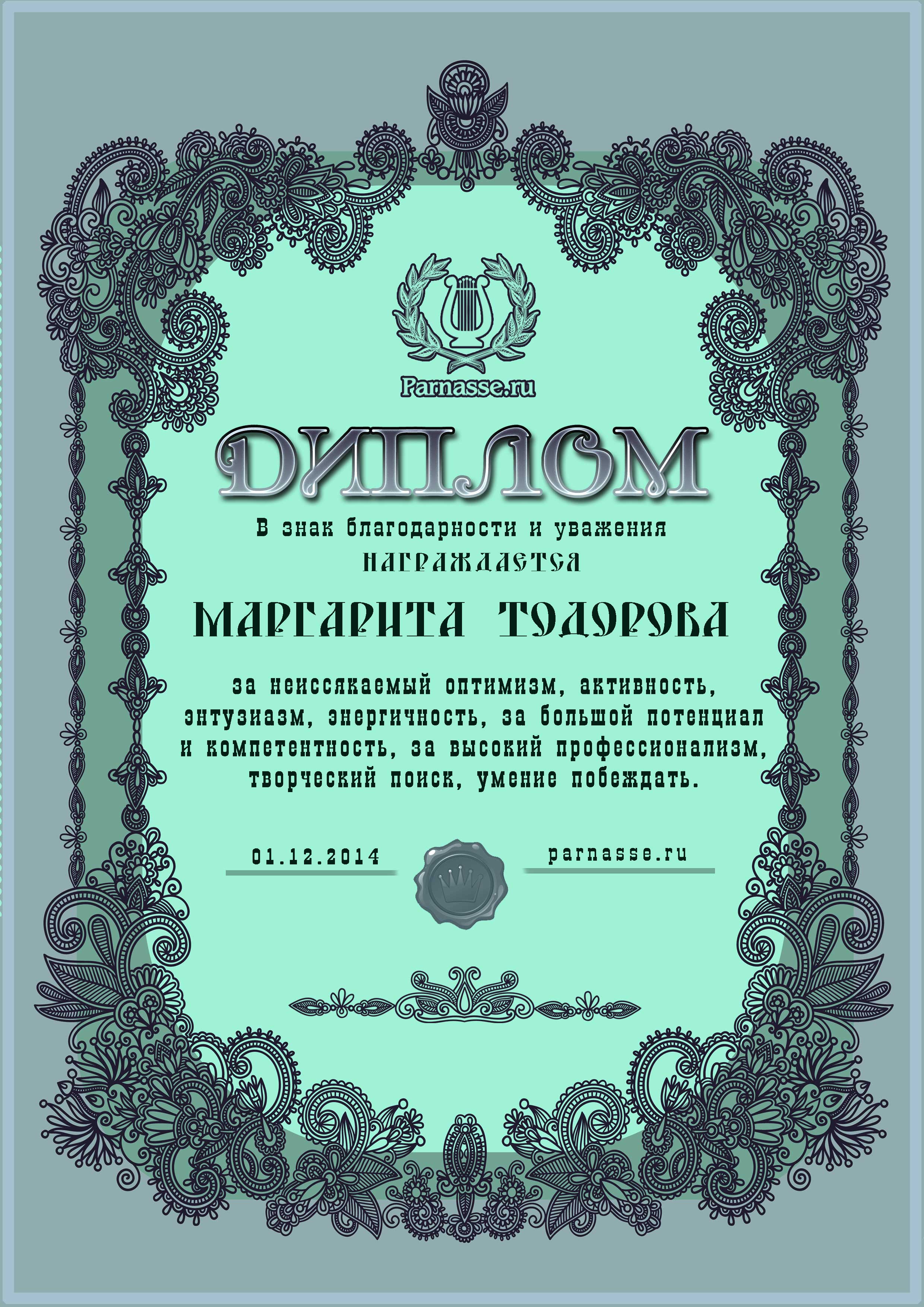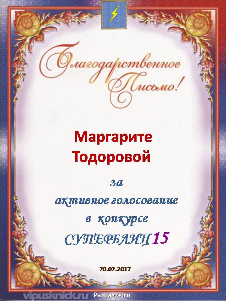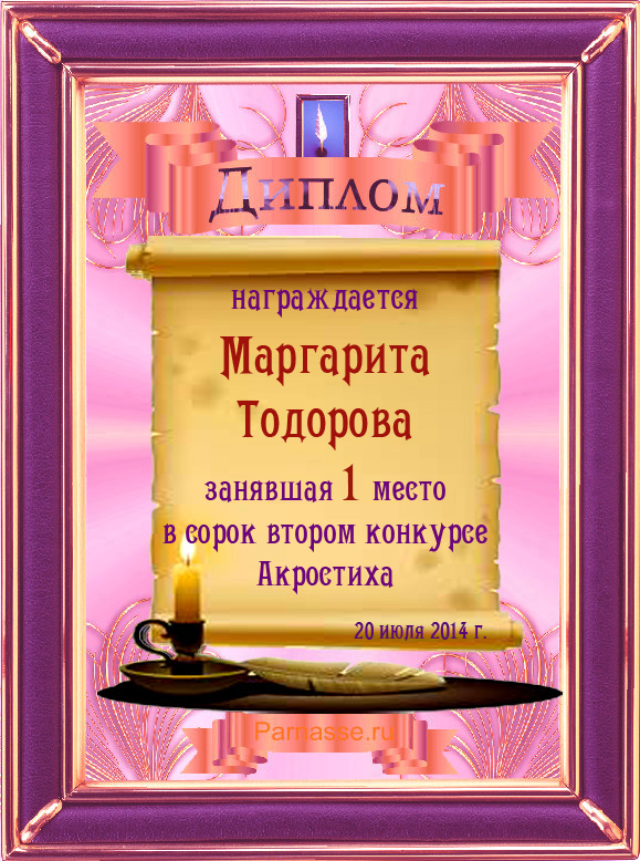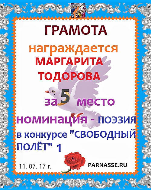 За неугасающую и неисчерпаемую творческую активность, постоянный контакт с Музой и признание сообществом "Парнасцев".От всей души желаем Вам, Маргарита, здоровья, любви, успехов, благополучия, удачи и творческого вдохновения!