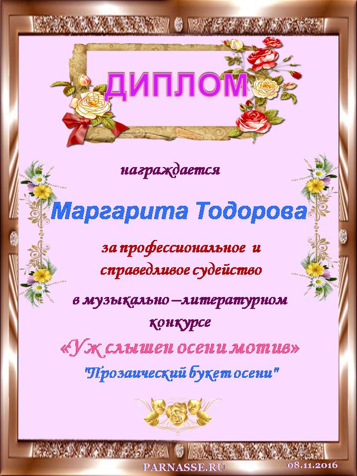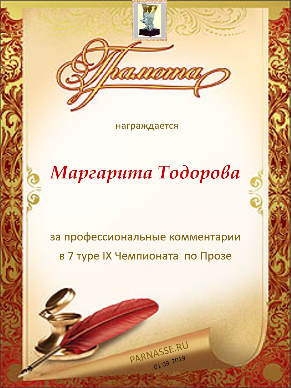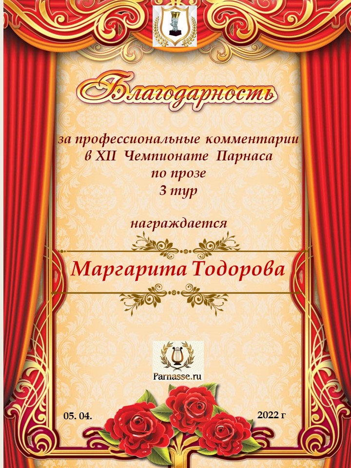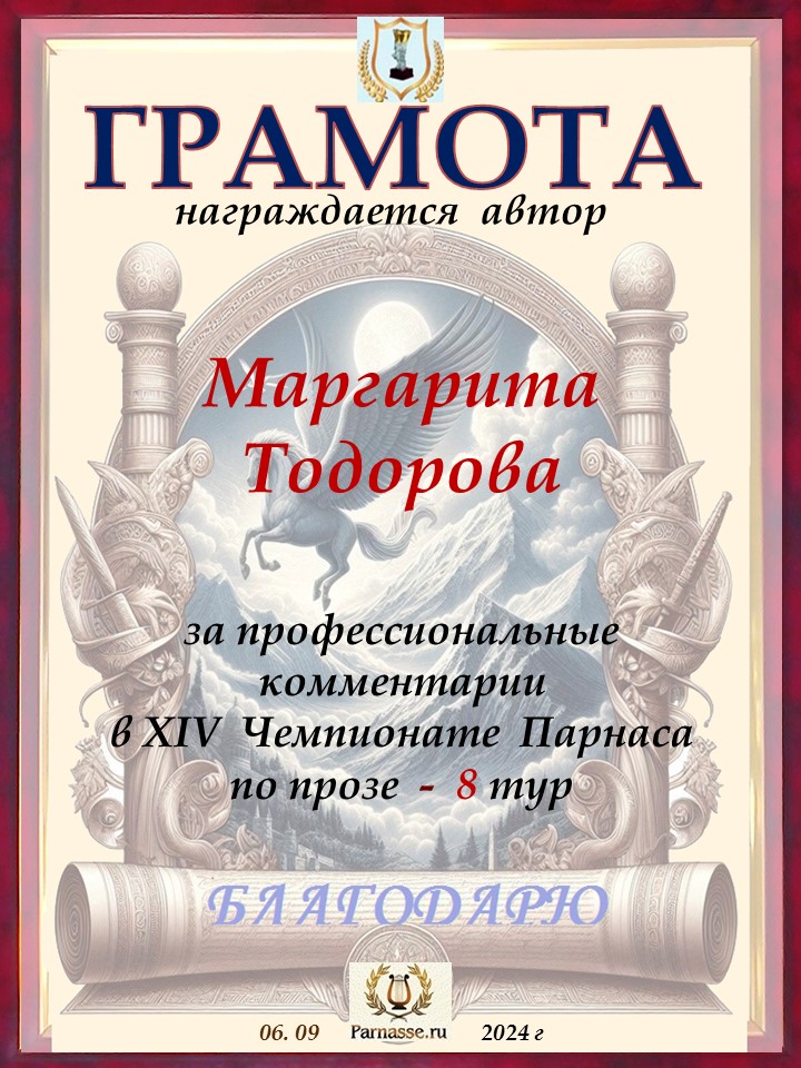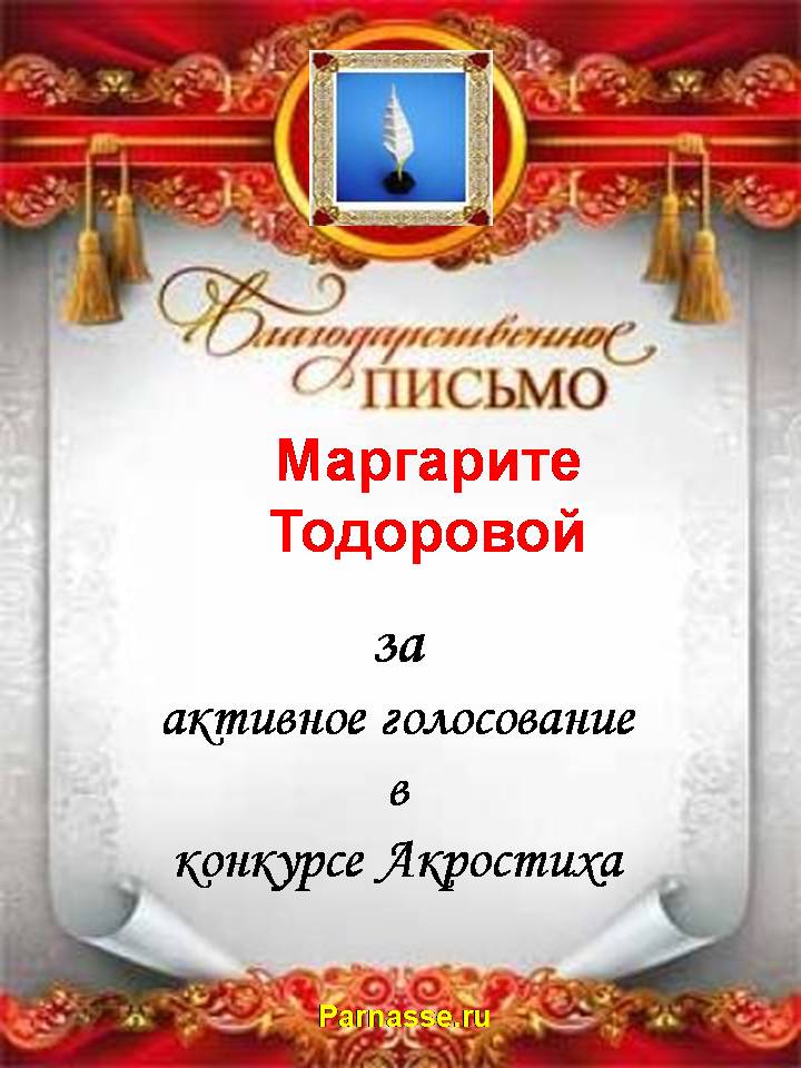 За неугасающую и неисчерпаемую творческую активность, постоянный контакт с Музой и признание сообществом "Парнасцев".От всей души желаем Вам, Маргарита, здоровья, любви, успехов, благополучия, удачи и творческого вдохновения!