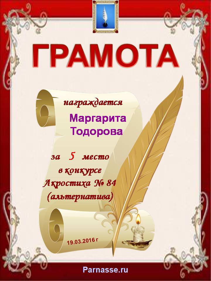 Грамота за 5 место в 121 конкурсе АКРОСТИХА (Альтернатива)! ПОЗДРАВЛЯЮ!