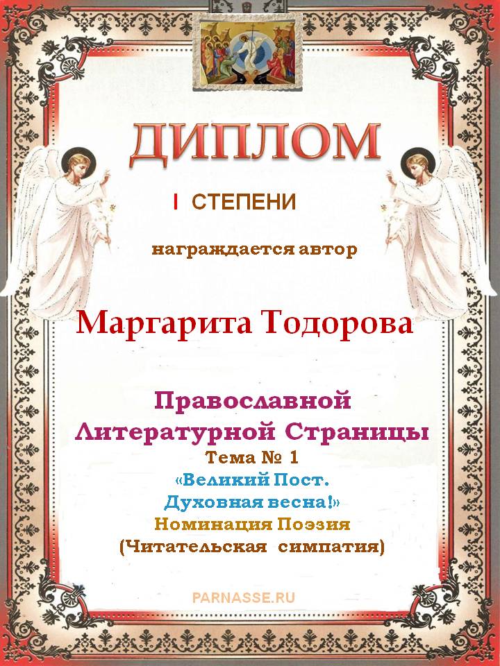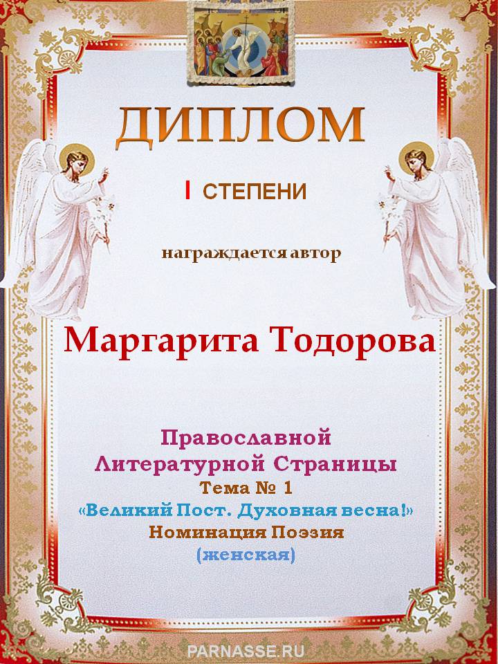 За прекрасную победу на Православной Литературной Странице, Тема № 1 "Великий Пост. Духовная весна!"Номинация Поэзия.