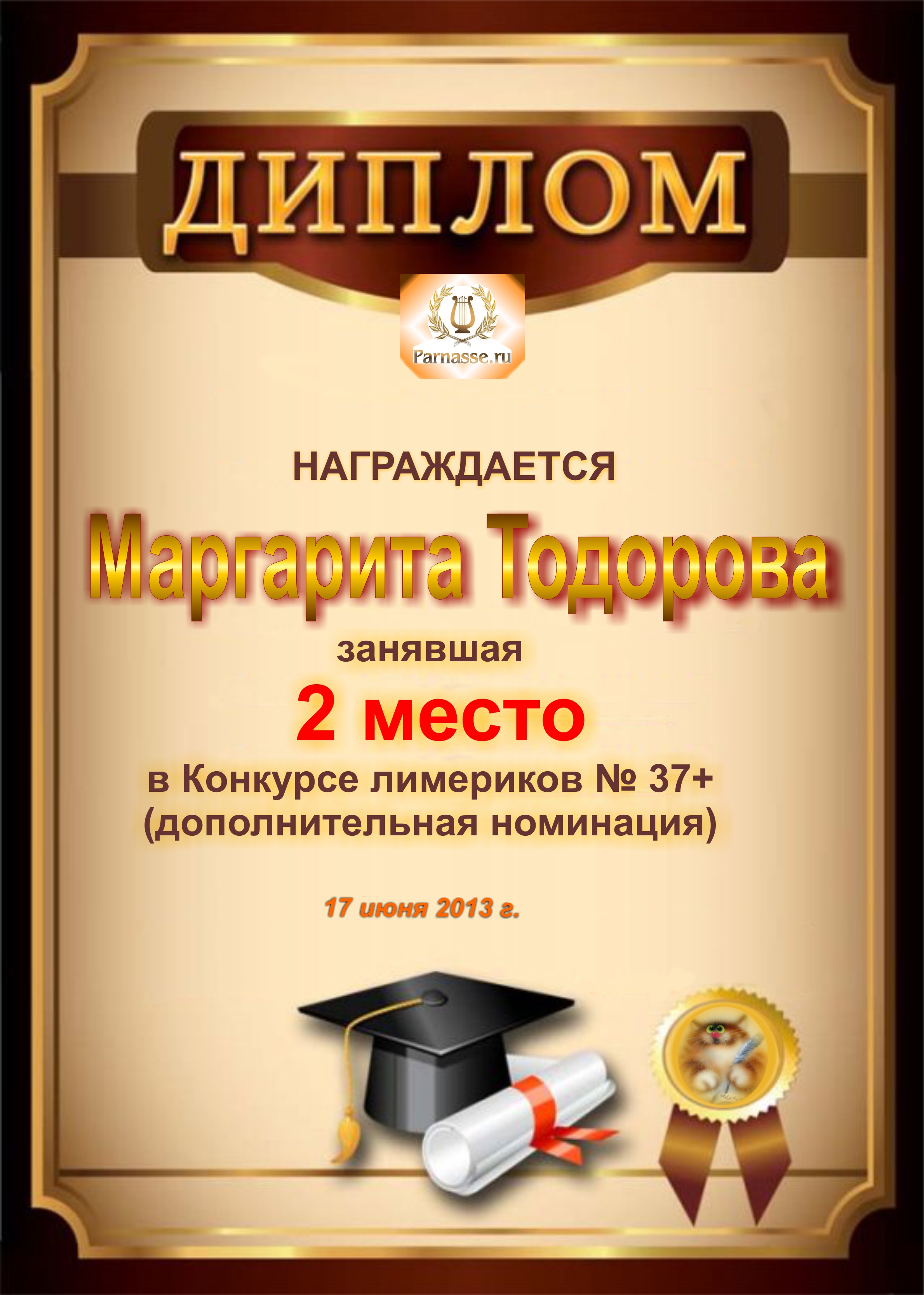 Диплом за победу и 2 место в дополнительной номинации конкурса лимериков № 37+ (17.06.2013 г.)