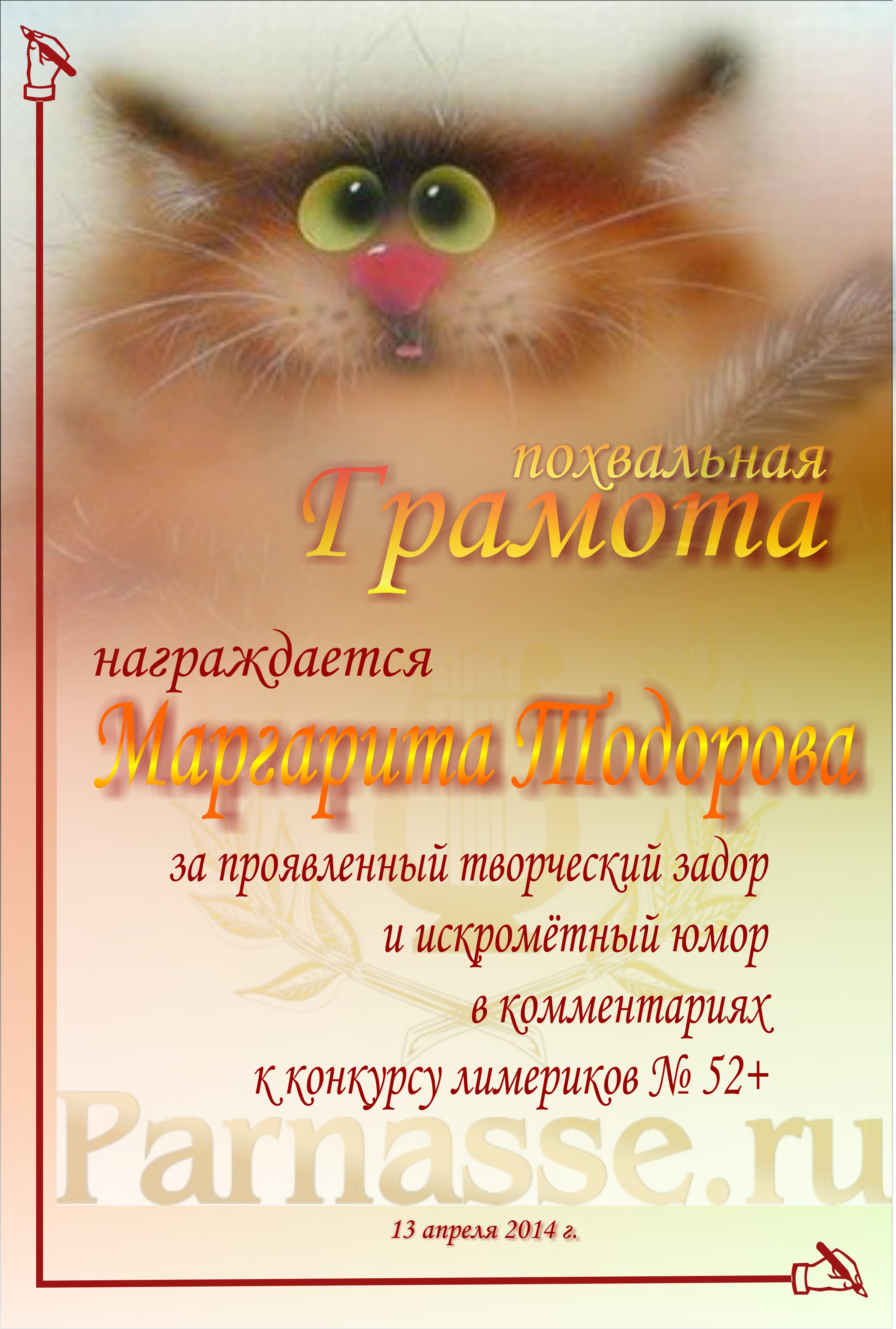 Похвальная грамота за активное участие в комментариях конкурса лимериков № 50+ (2.03.2014 г.)