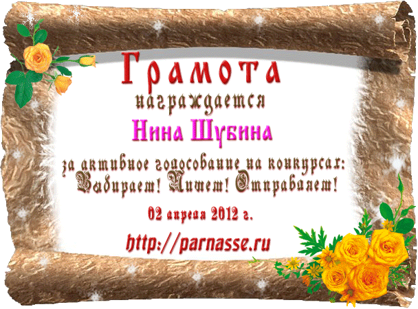 От лица Администрации творческого портала "Парнас" вручаем Вам этот памятный знак с самыми наилучшими пожеланиями! Пусть Вас весь год не покидает творческий запал, удача, а здоровье будет столь же крепким и нерушимым, как и традиция Новогоднего праздника! Счастья, успехов и любви Вам и Вашей семье, друзьям и близким!