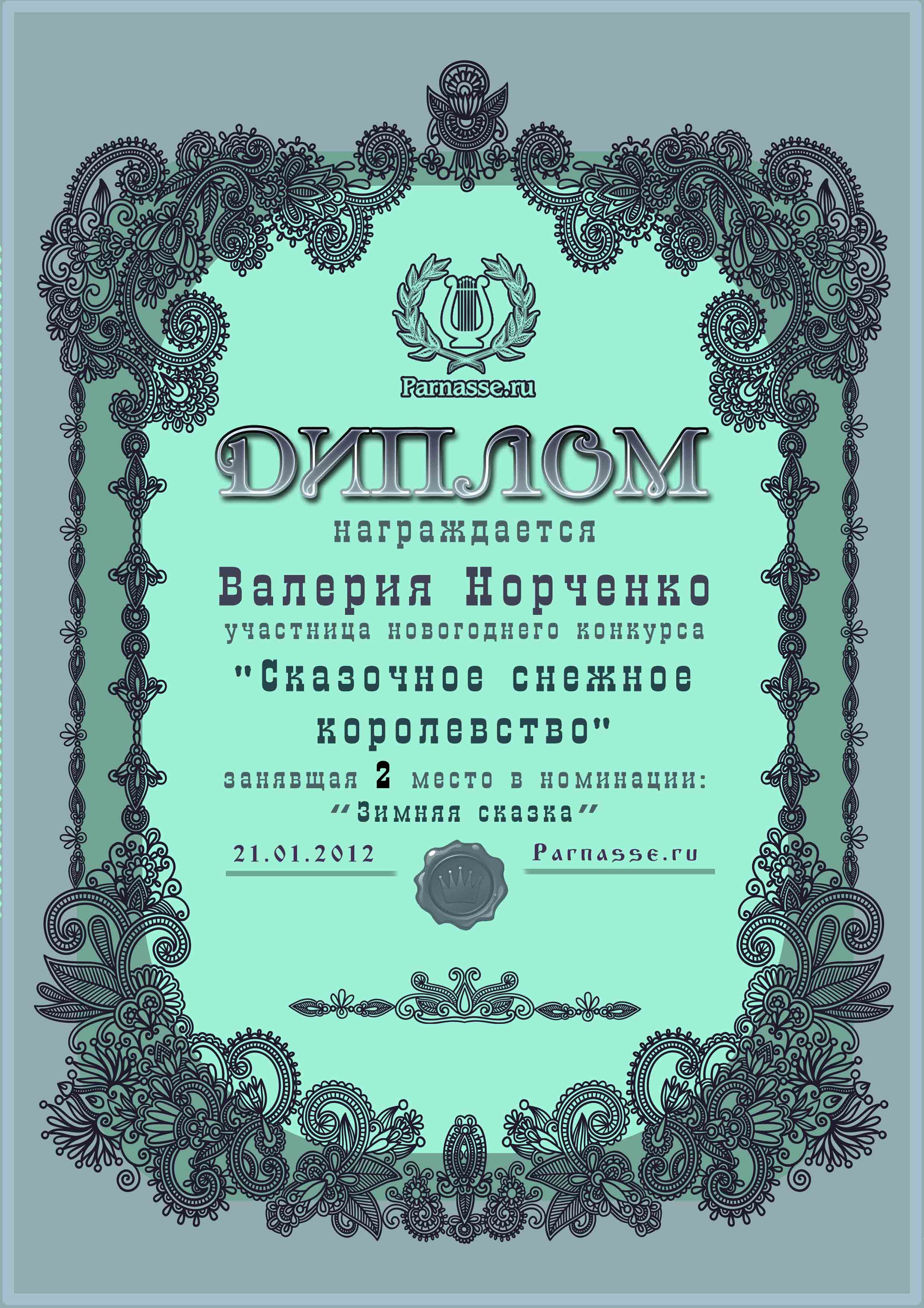 Третье место в музыкально-литературном конкурсе «ЗИМНЯЯ СКАЗКА», в прозаической номинации «Снежок»! Произведение «Зимой»! Поздравляем с блестящей победой в конкурсе!