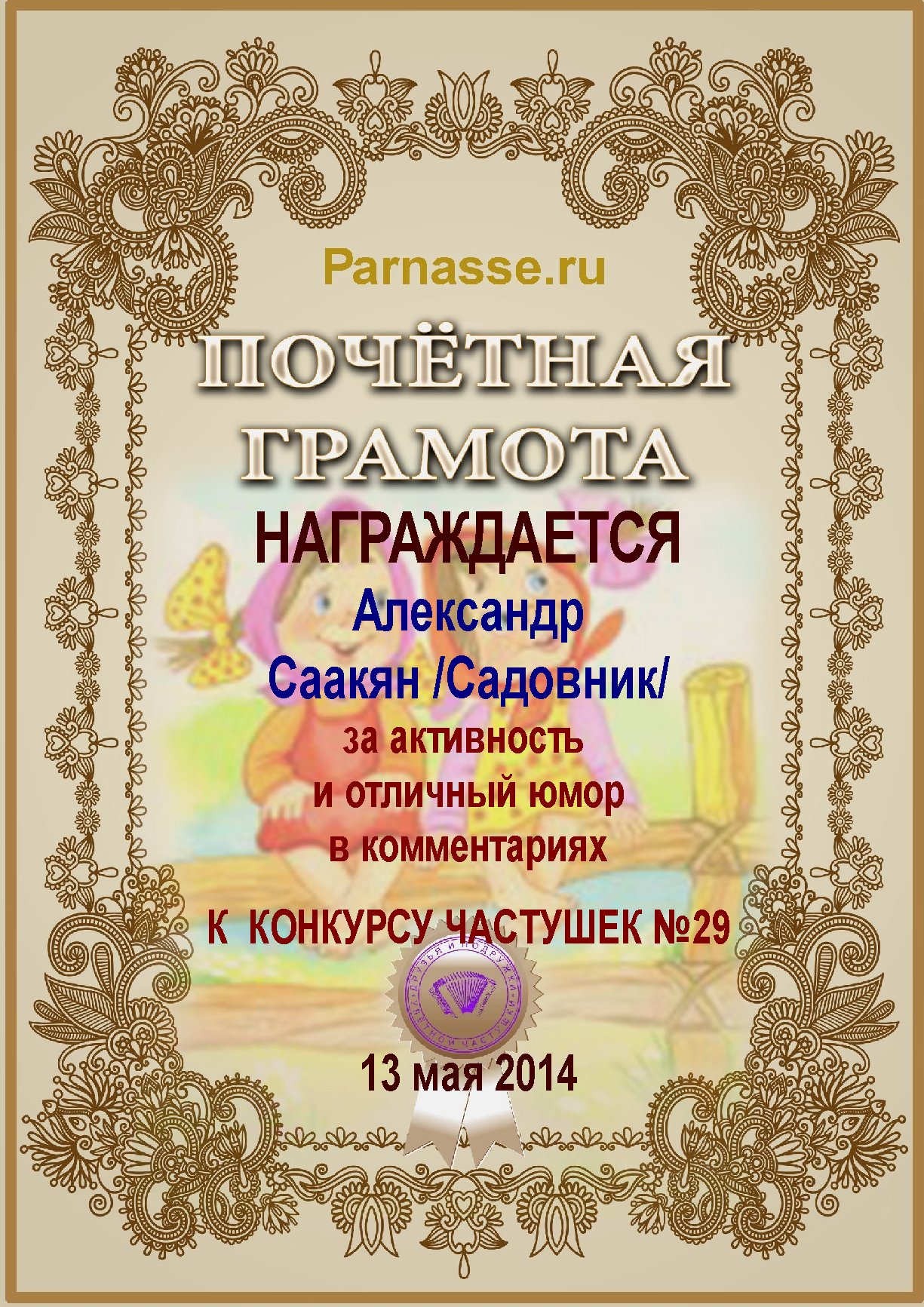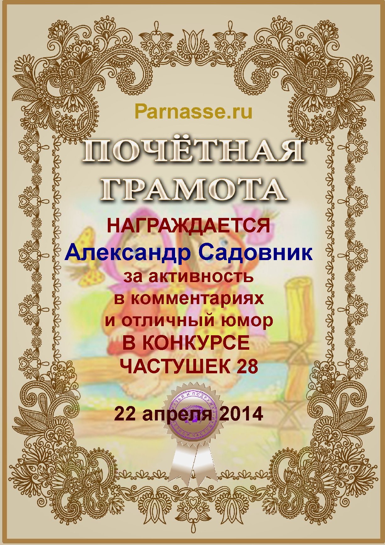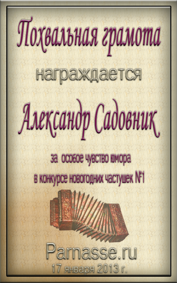 Грамота за активное участие и отличный юмор в комментариях к конкурсу частушек №35