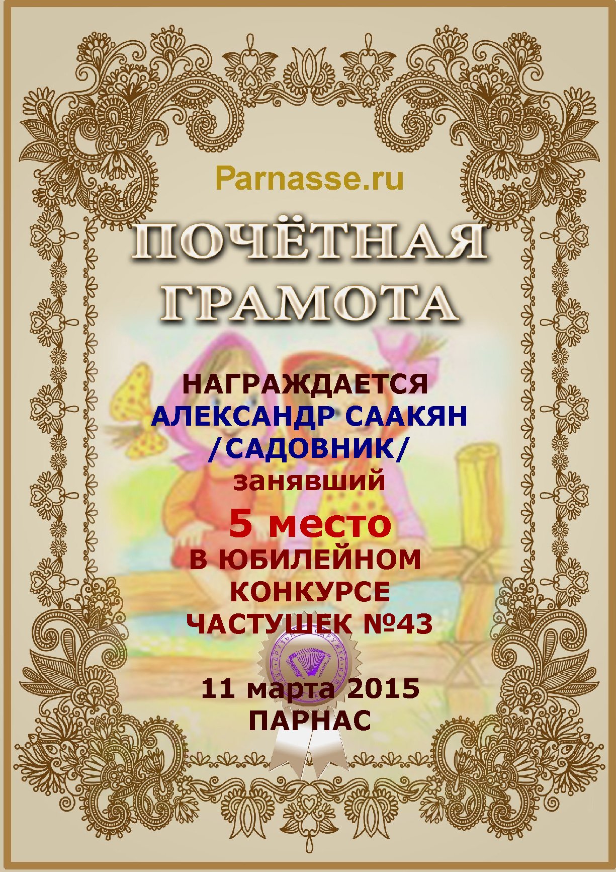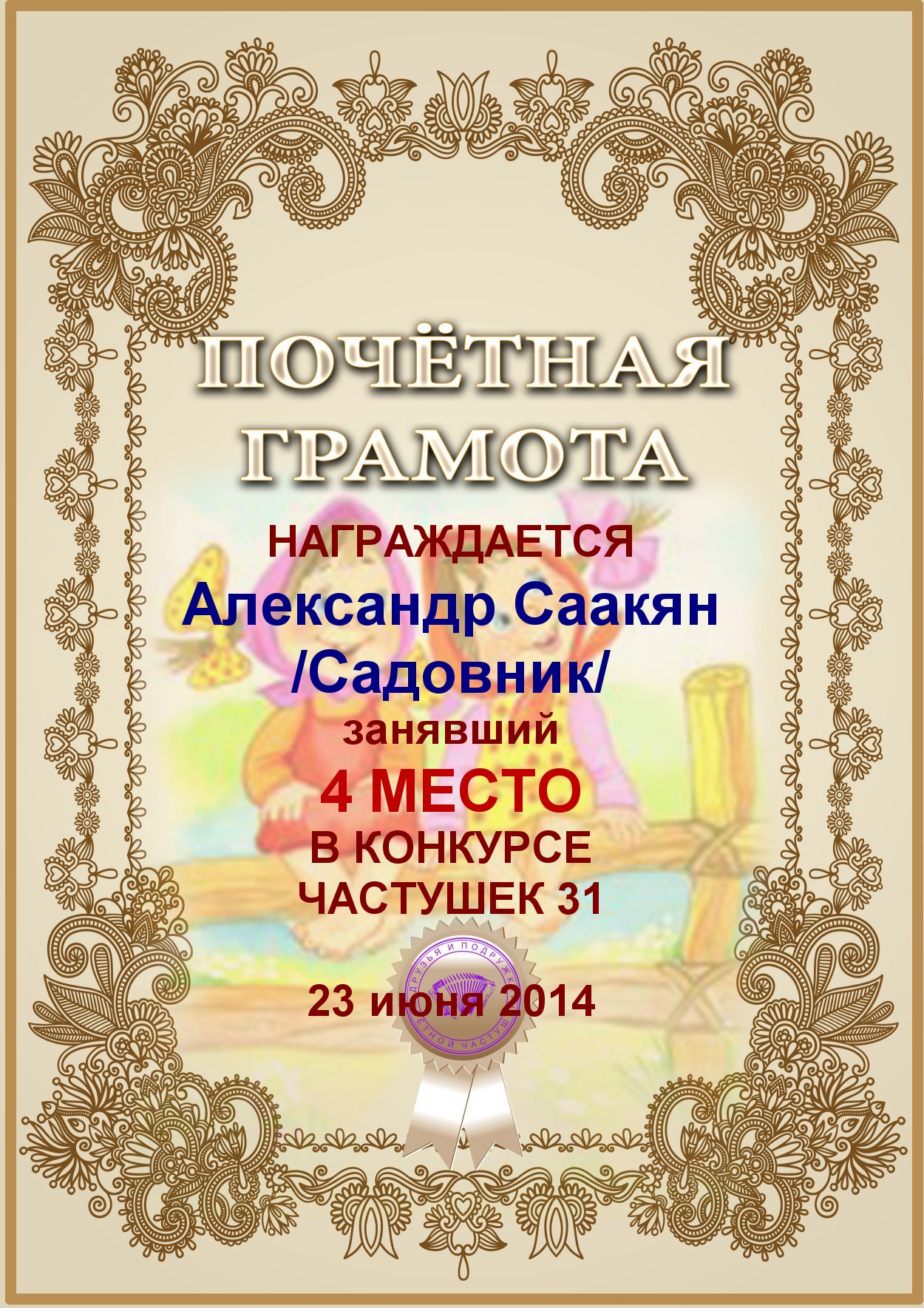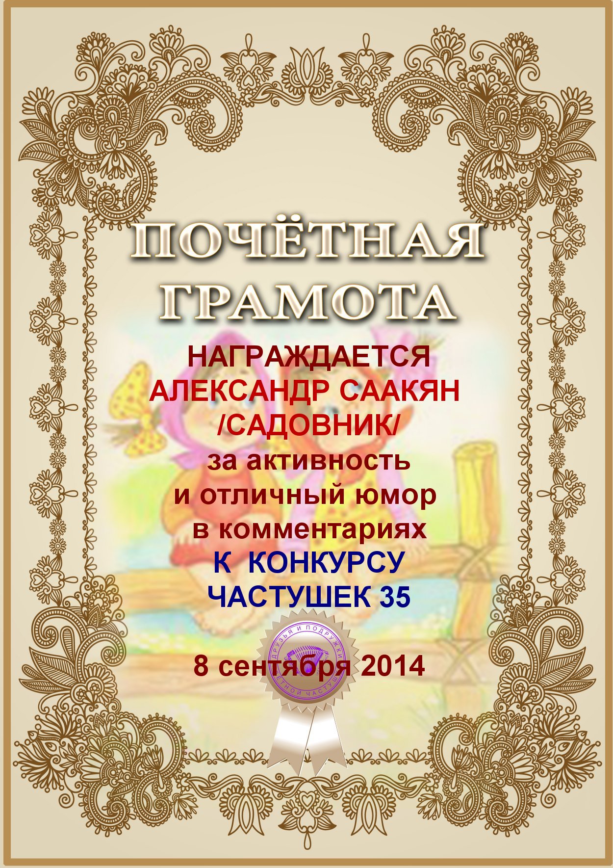 Грамота за активное участие и отличный юмор в комментариях к конкурсу частушек №35