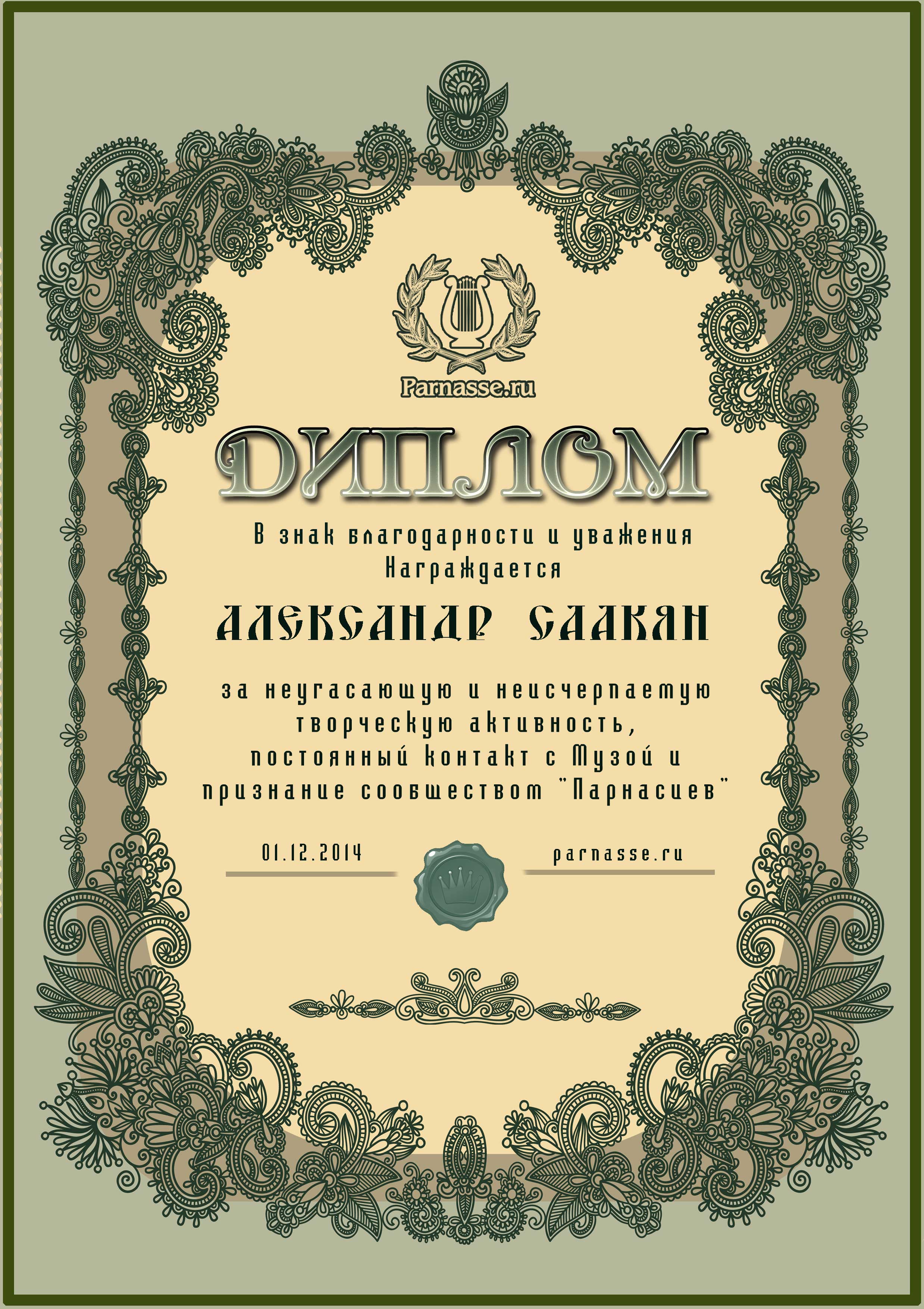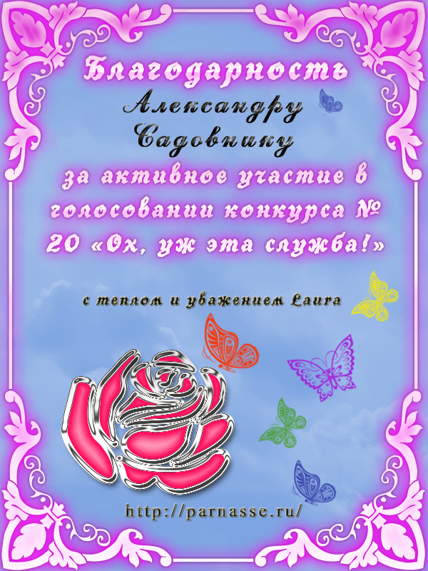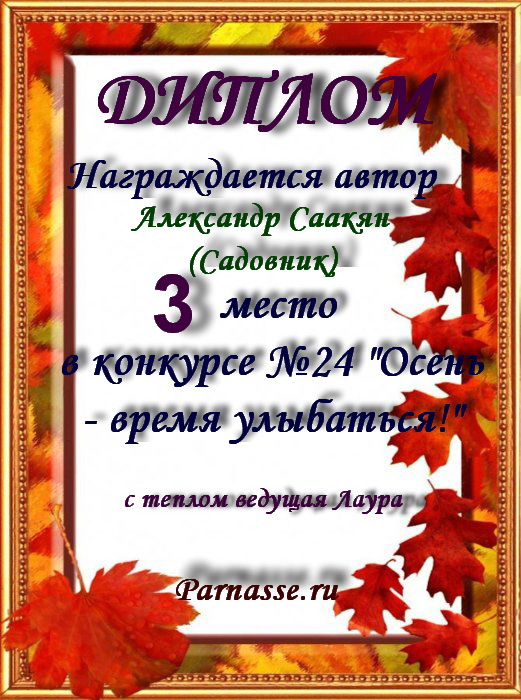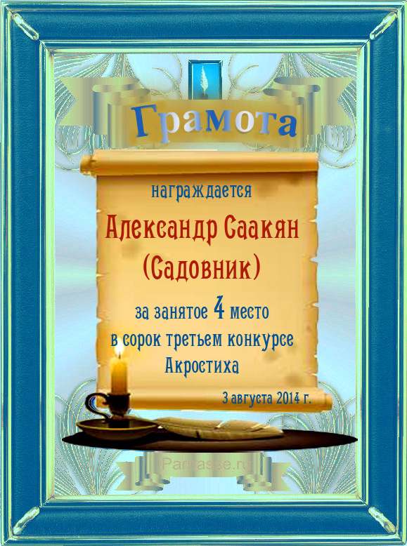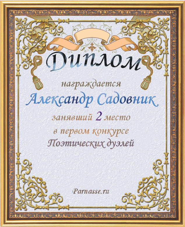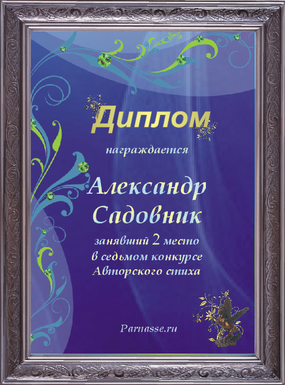 За неугасающую и неисчерпаемую творческую активность, постоянный контакт с Музой и признание сообществом "Парнасцев".От всей души желаем Вам, Александр, здоровья, любви, успехов, благополучия, удачи и творческого вдохновения!