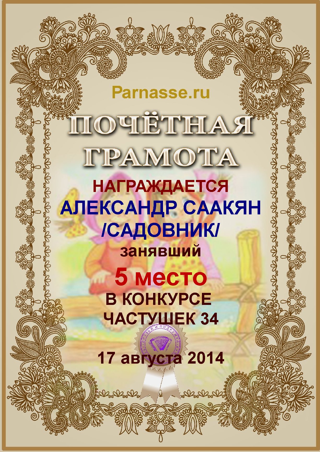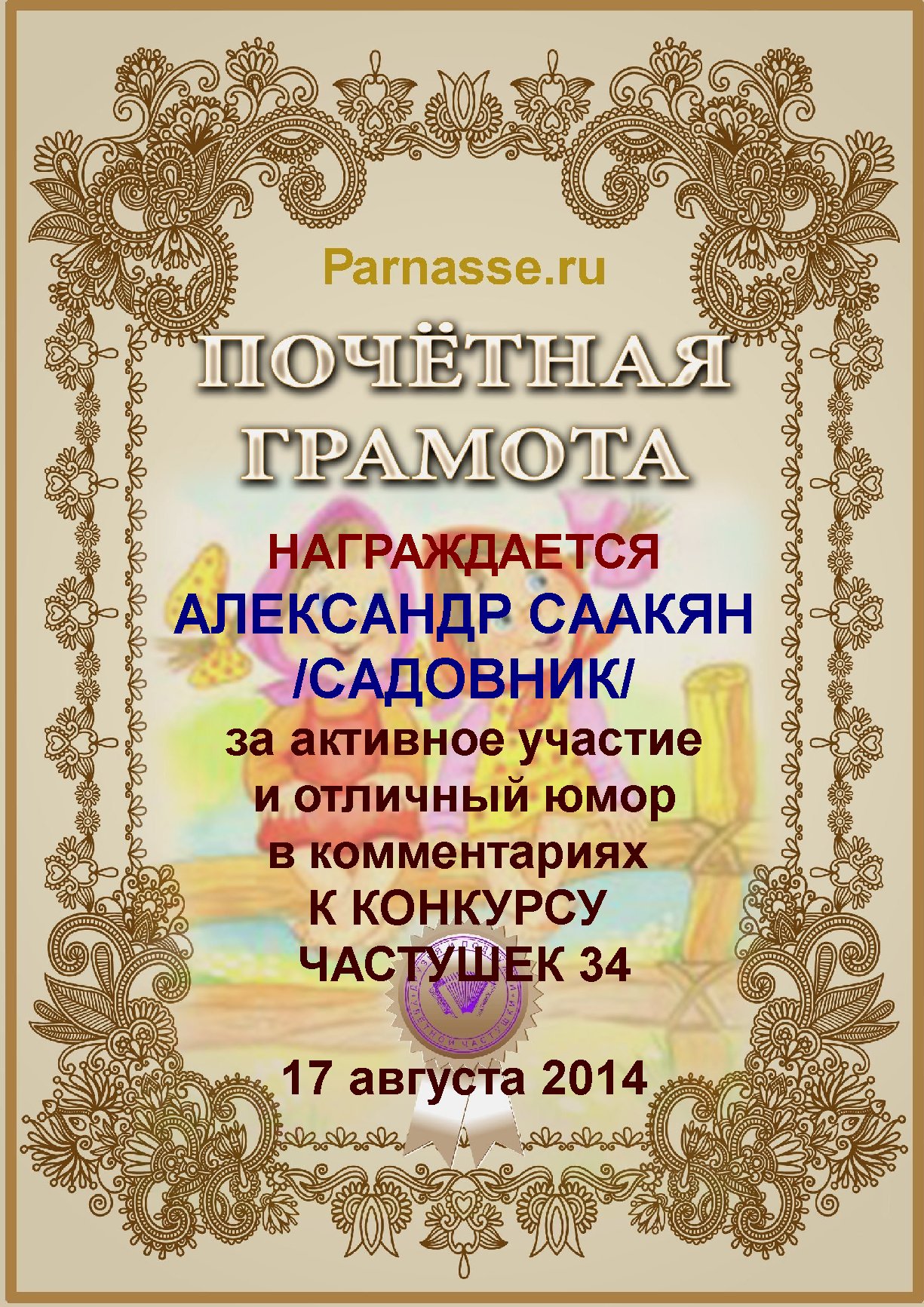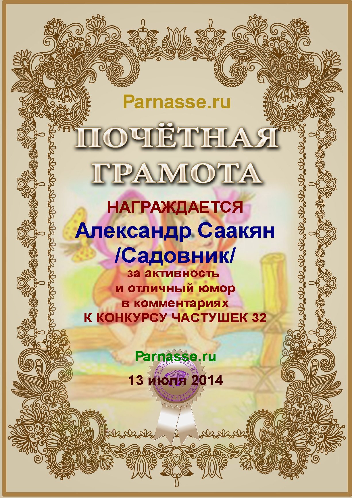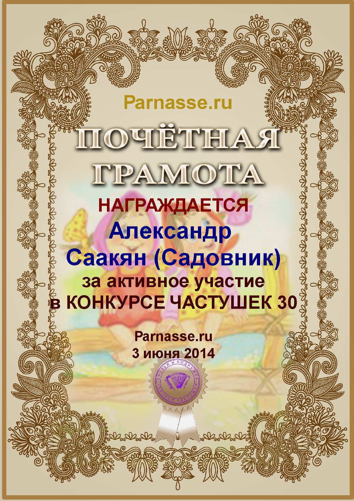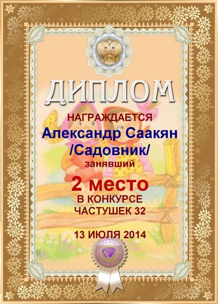 Грамота за активное участие и отличный юмор в комментариях к конкурсу частушек №34