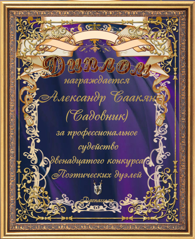 ДИПЛОМ ЗА ПРОФЕССИОНАЛЬНОЕ СУДЕЙСТВО ДВЕНАДЦАТОГО КОНКУРСА ПОЭТИЧЕСКИХ ДУЭЛЕЙ