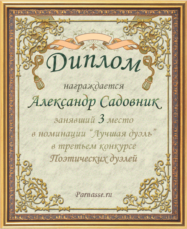 Диплом за третье место в номинации "Лучшая дуэль" в третьем конкурсе Поэтических дуэлей