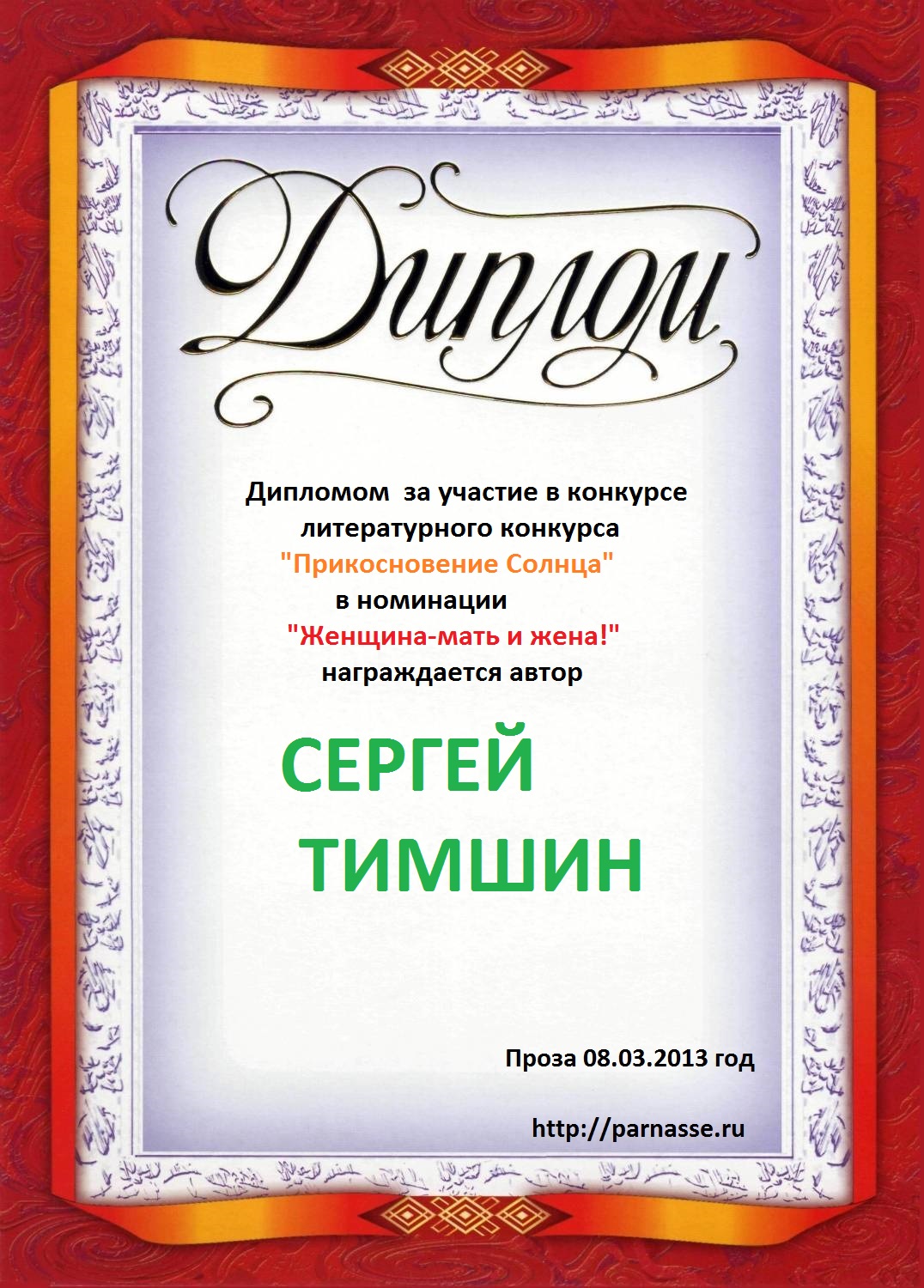 Диплом в конкурсе поэзии "Прикосновение Солнца"