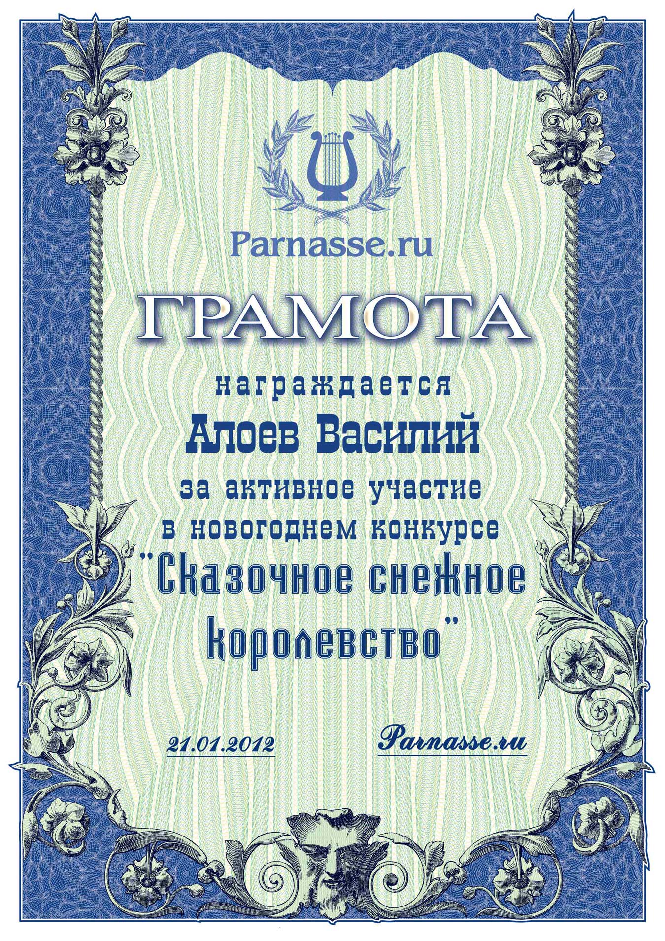 От лица Администрации творческого портала "Парнас" вручаем Вам этот памятный знак с самыми наилучшими пожеланиями! Пусть Вас весь год не покидает творческий запал, удача, а здоровье будет столь же крепким и нерушимым, как и традиция Новогоднего праздника! Счастья, успехов и любви Вам и Вашей семье, друзьям и близким!
