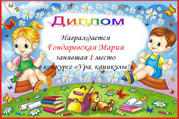 ДИПЛОМ ЗА ПЕРВОЕ МЕСТО В КОНКУРСЕ "Ура каникулы!"