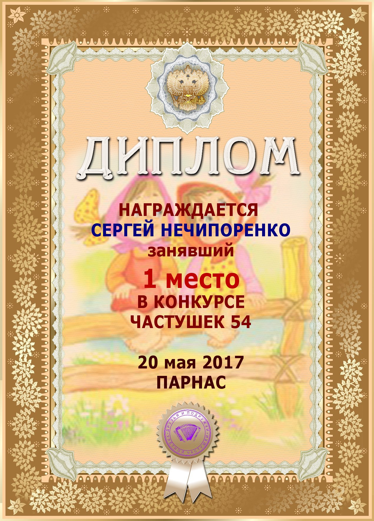 Диплом за победу в конкурсе частушек №20+
