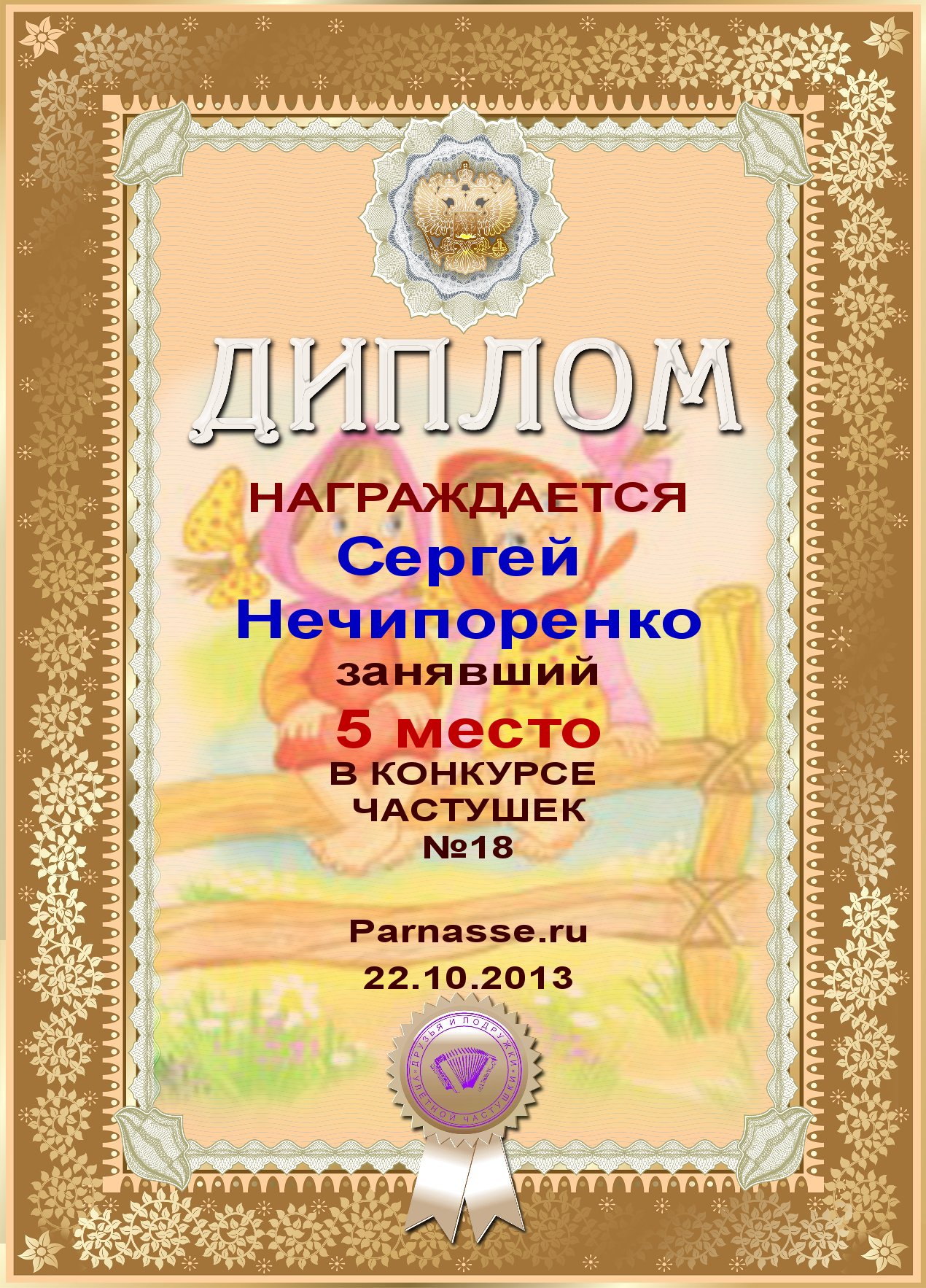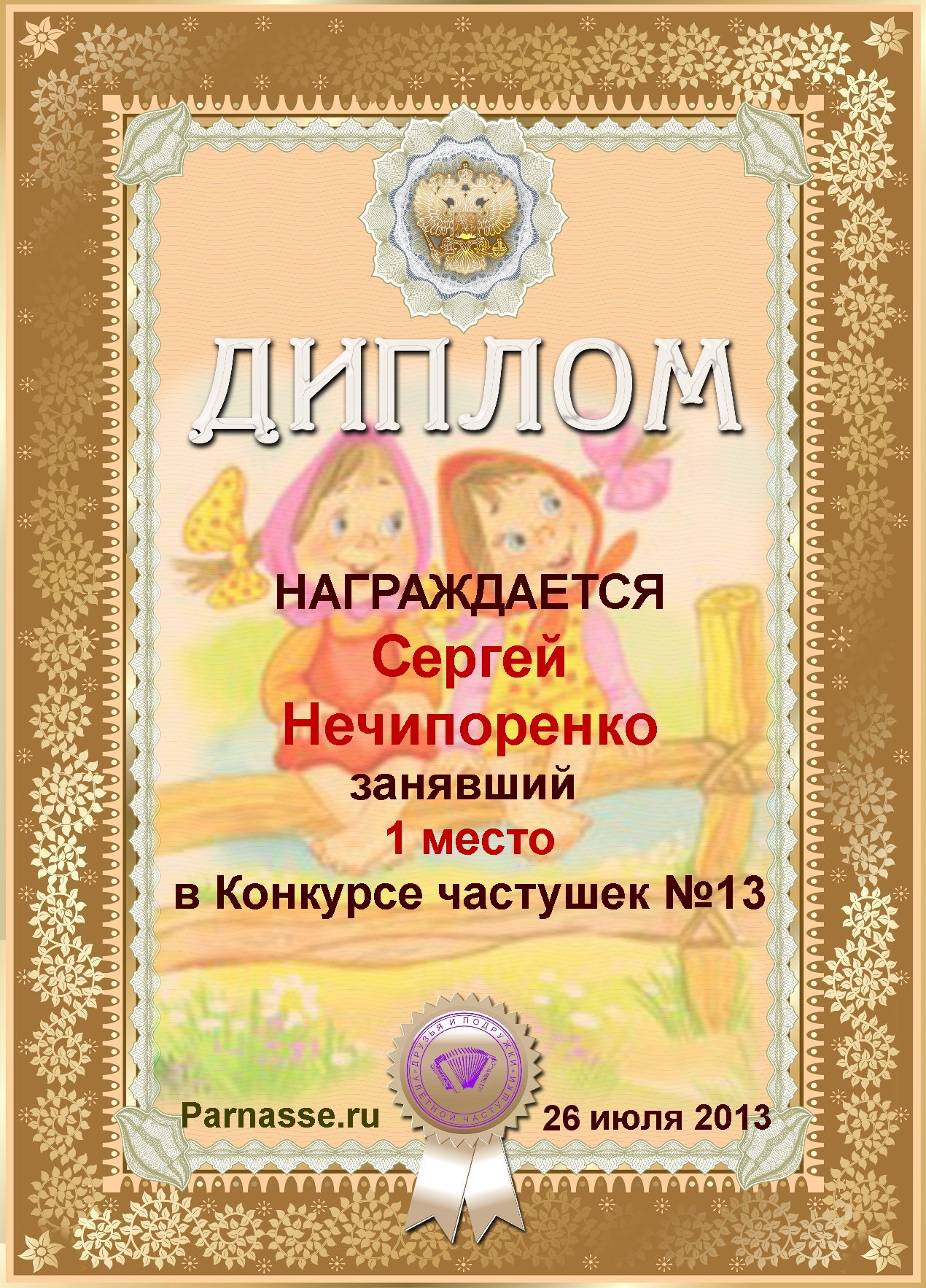 Диплом за победу в конкурсе частушек №13