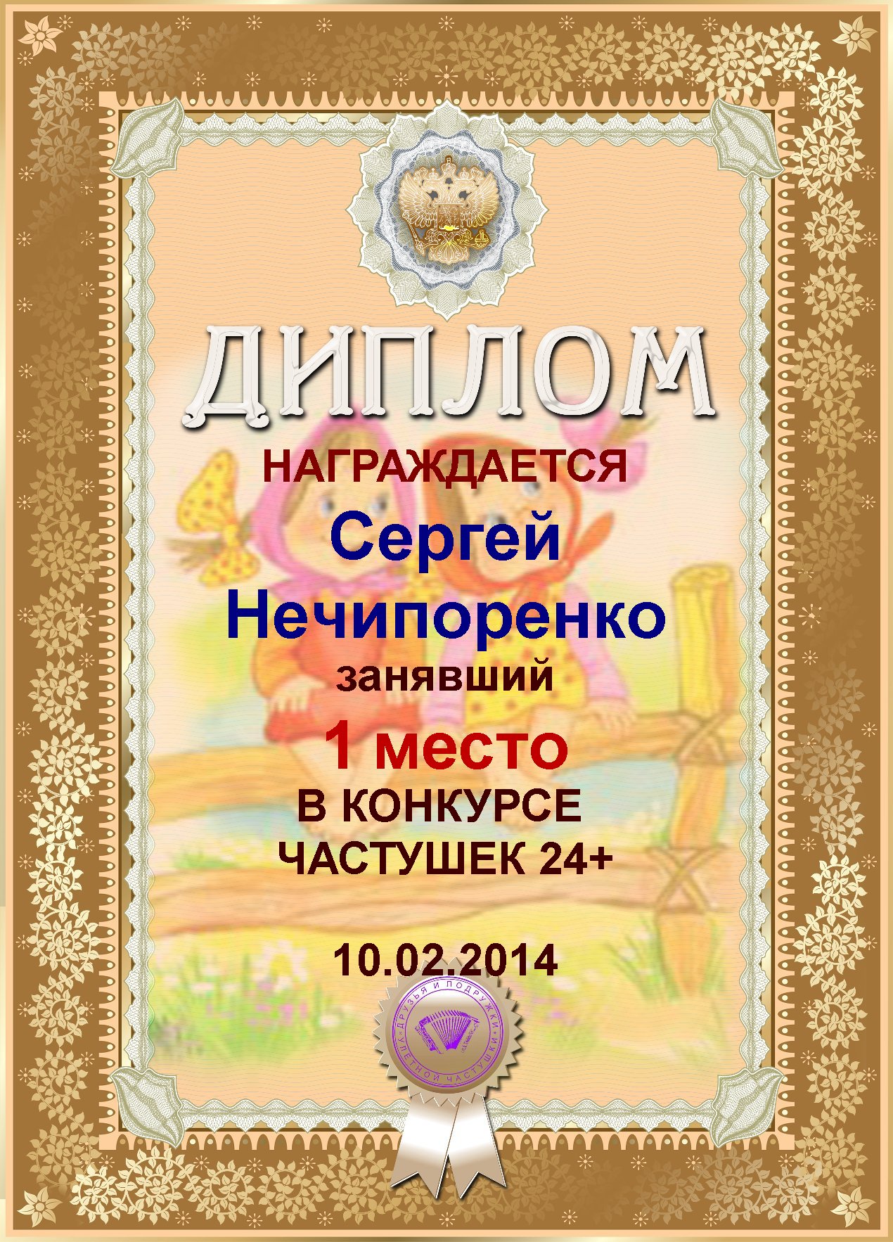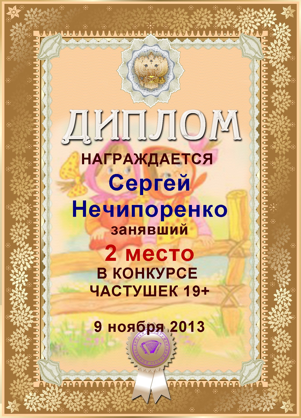 Диплом за 1е место в конкурсе частушек 19+