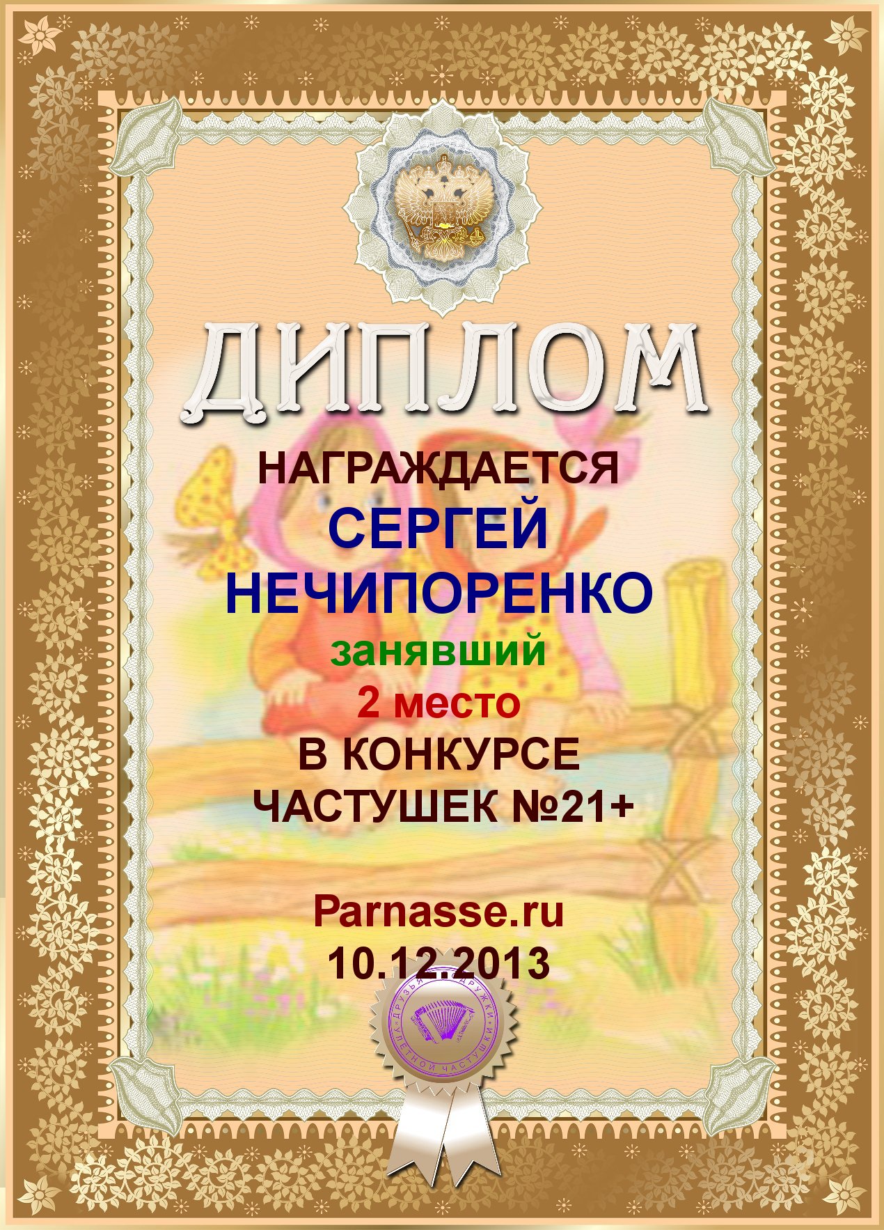 Диплом за 2е место в конкурсе частушек №21+