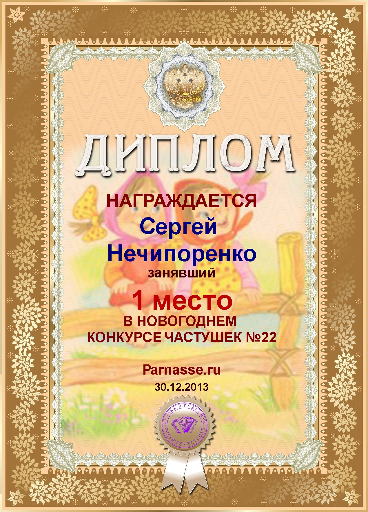 Диплом за 1е место в новогоднем конкурсе частушек №22