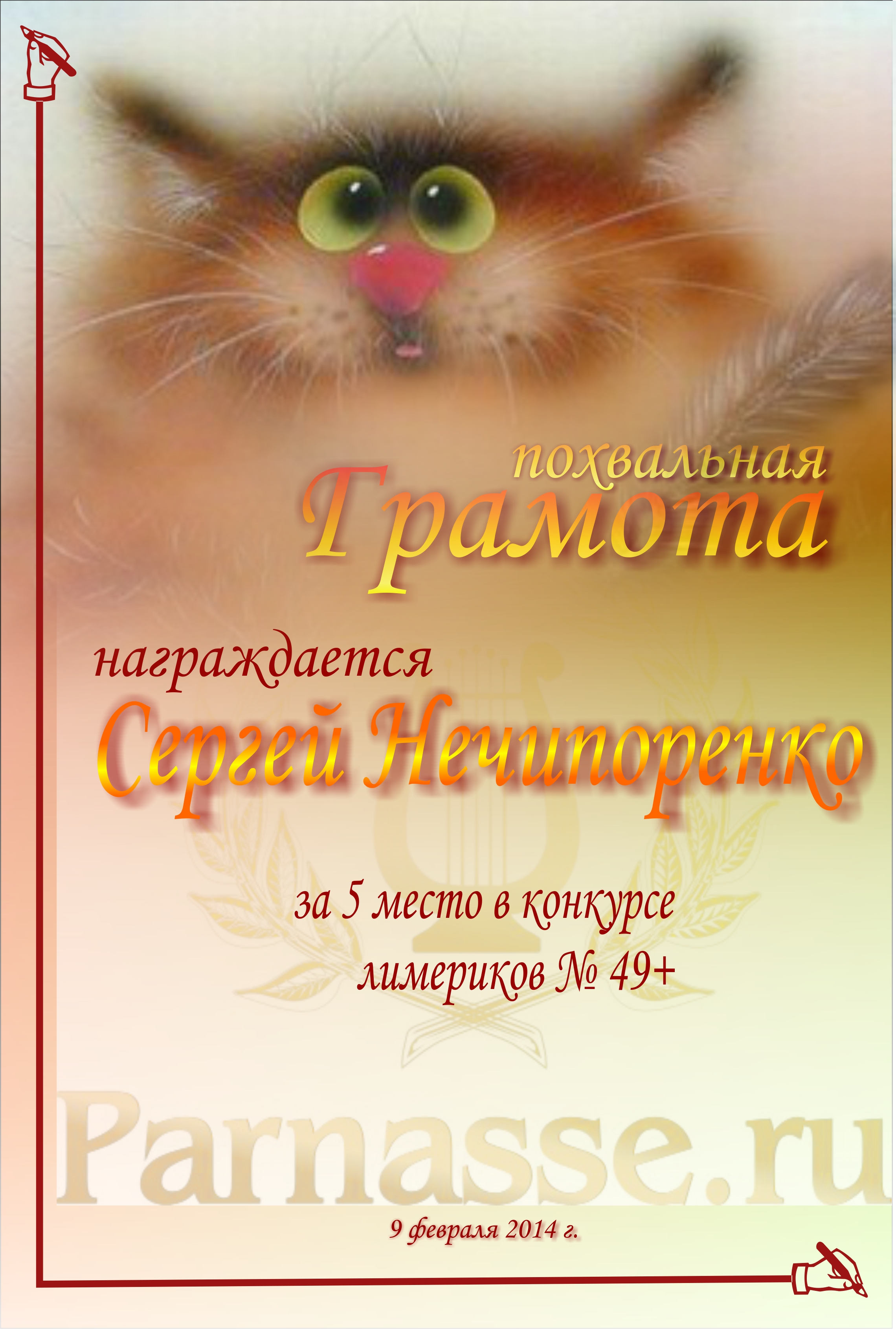 Похвальная грамота за 5 место в конкурсе лимериков № 49+ (9.02.2014 г.)