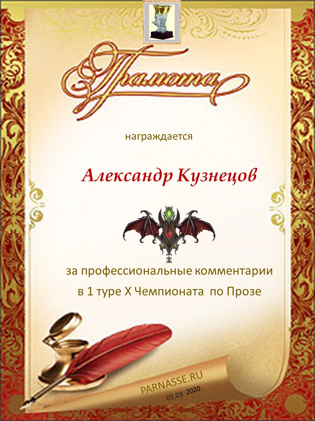 Вручается за комментарии в X Чемпионате Парнаса по Прозе - 1 тур