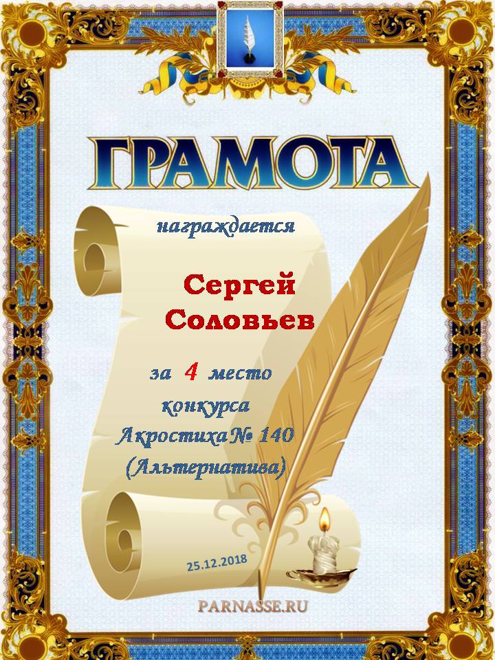 Грамота за 4 место в 140 конкурсе АКРОСТИХА (Альтернатива)! ПОЗДРАВЛЯЮ!