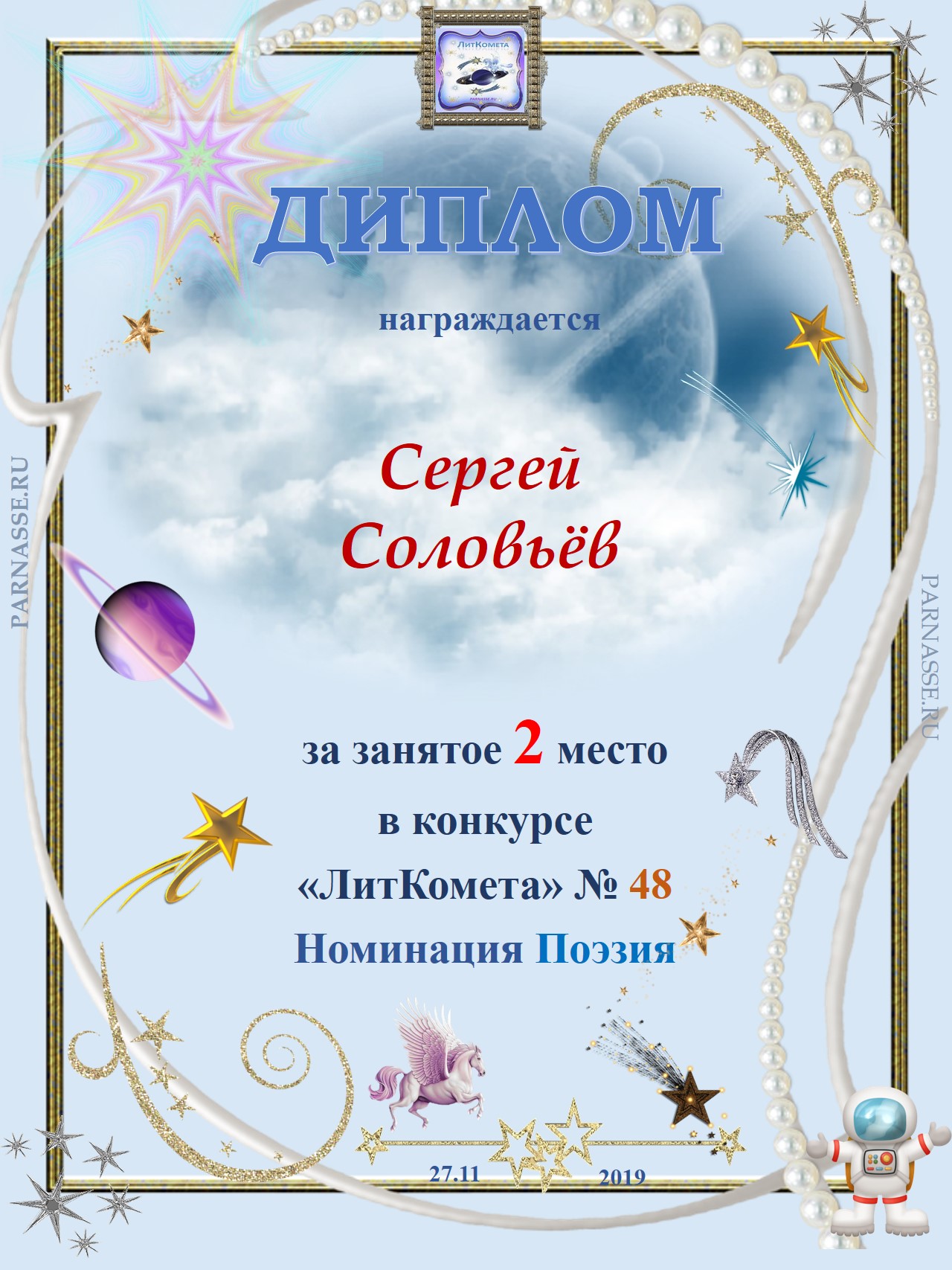 Поздравляю с занятым 2 местом в конкурсе "Литературная Комета - Полёт № 48" - Номинация Поэзия!