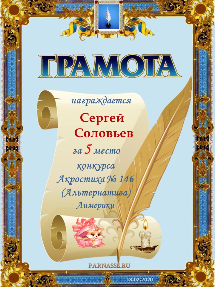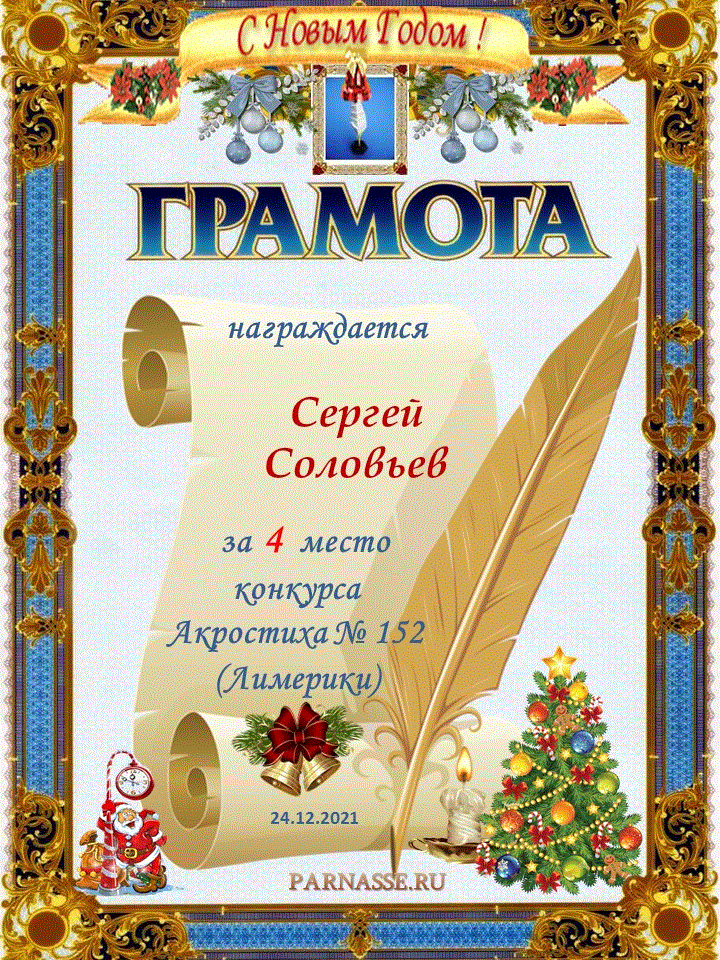 Грамота за 4 место в 152 конкурсе АКРОСТИХА (Альтернатива - лимерики)