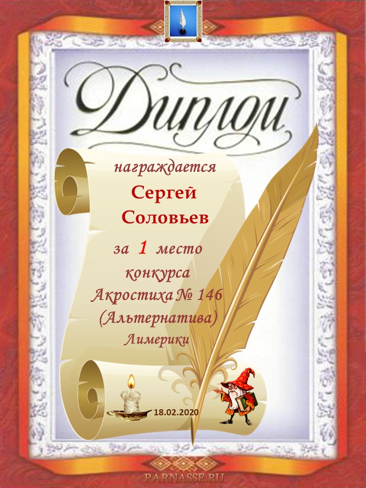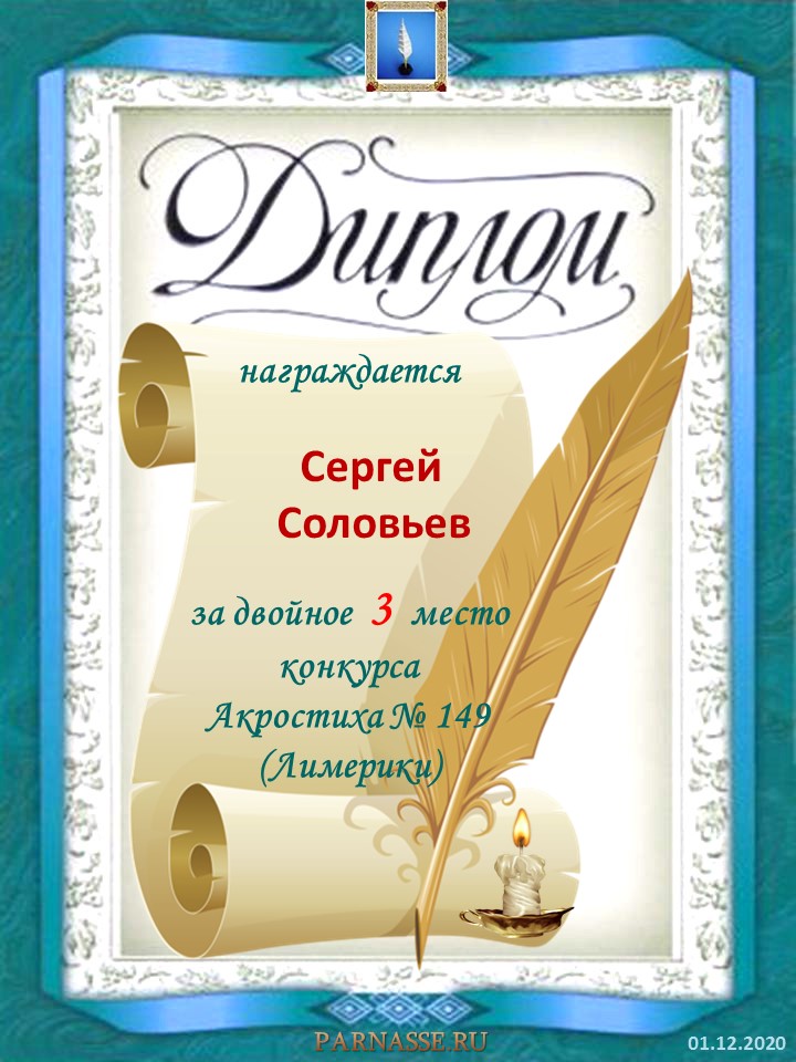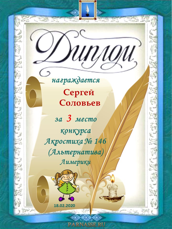 Диплом за 3 место в 152 конкурсе АКРОСТИХА (Альтернатива - лимерики)